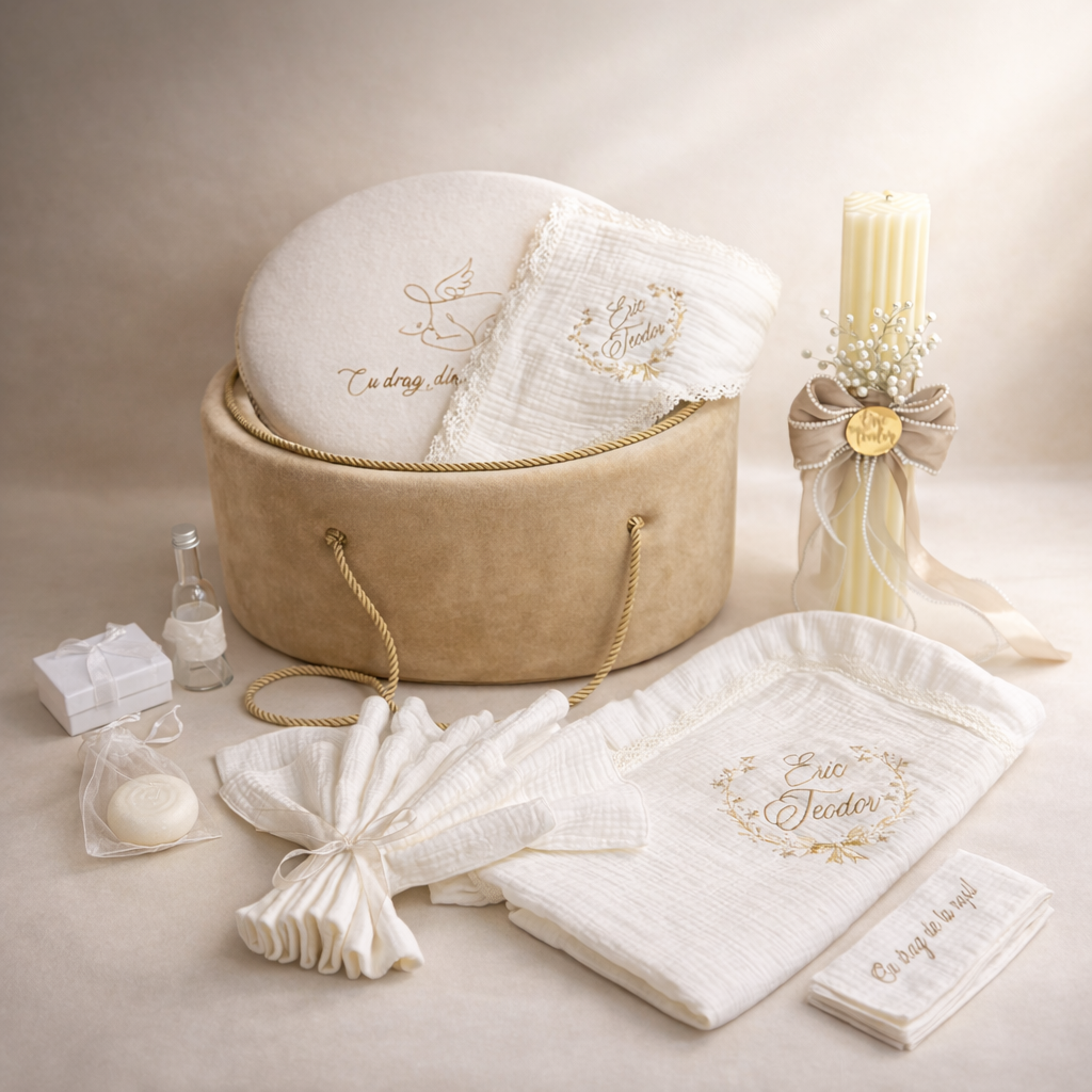 Trusou botez premium personalizat – ghid complet 2026. Descoperă ce trebuie să conțină un set complet și cum alegi modele elegante pentru fetițe și băieți.