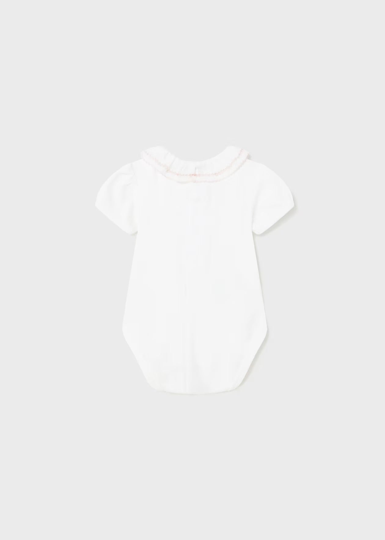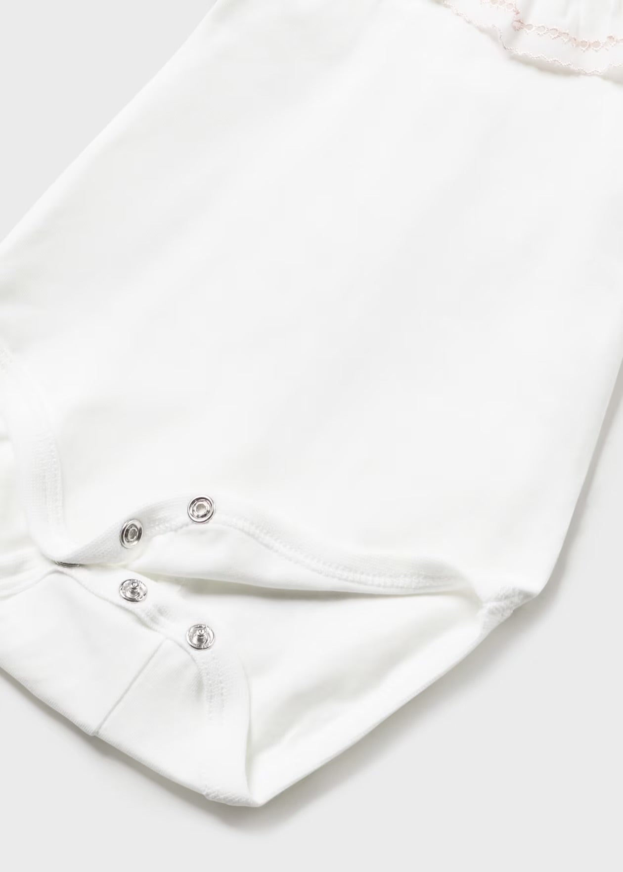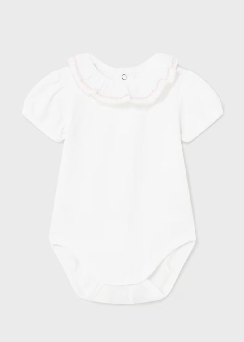 Body cu maneca scurta pentru nou-nascut. Guler rotund cu volanas. Inchidere prin capse pe partea posterioara. Capse intre picioare pentru a facilita imbracarea articolului.