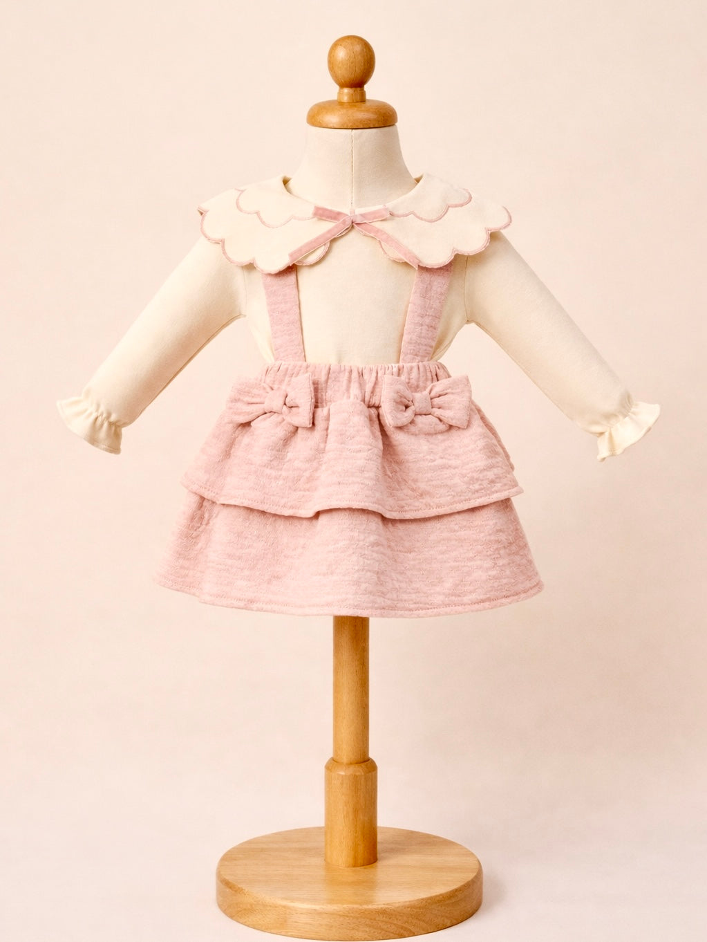 Compleu cu fustita cu bretele roz cu bluzota tip body crem din Bumbac – Delicatete pentru Primele Clipe (0-12 luni)