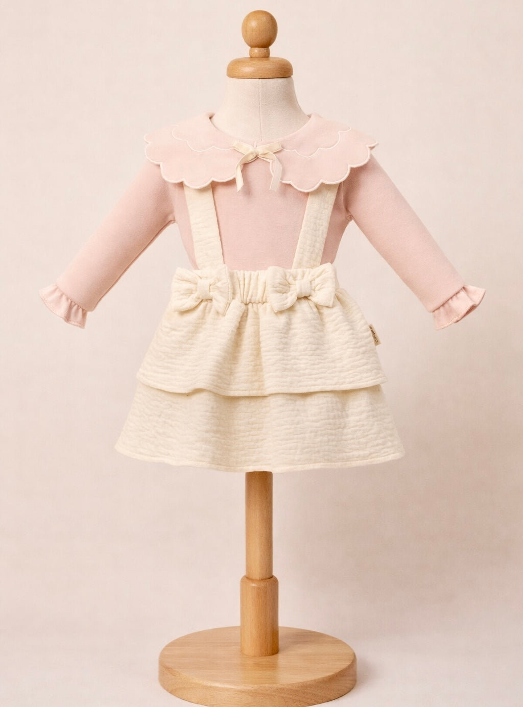 Compleu cu fustita cu bretele crem si bluzita tip body cu roz din Bumbac – Delicatete pentru Primele Clipe (0-12 luni)