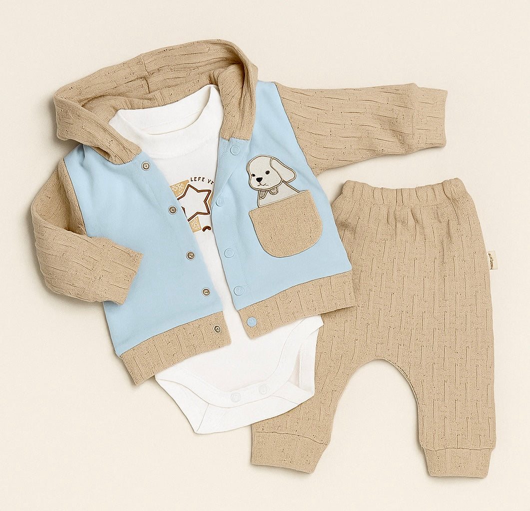 Setul este compus din bluza cu capse, bluza tip body si pantaloni