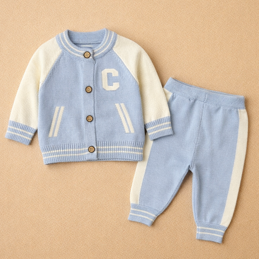 Setul tricotat moale si calitativ este compus din bluza cu nasturei in fata si pantaloni