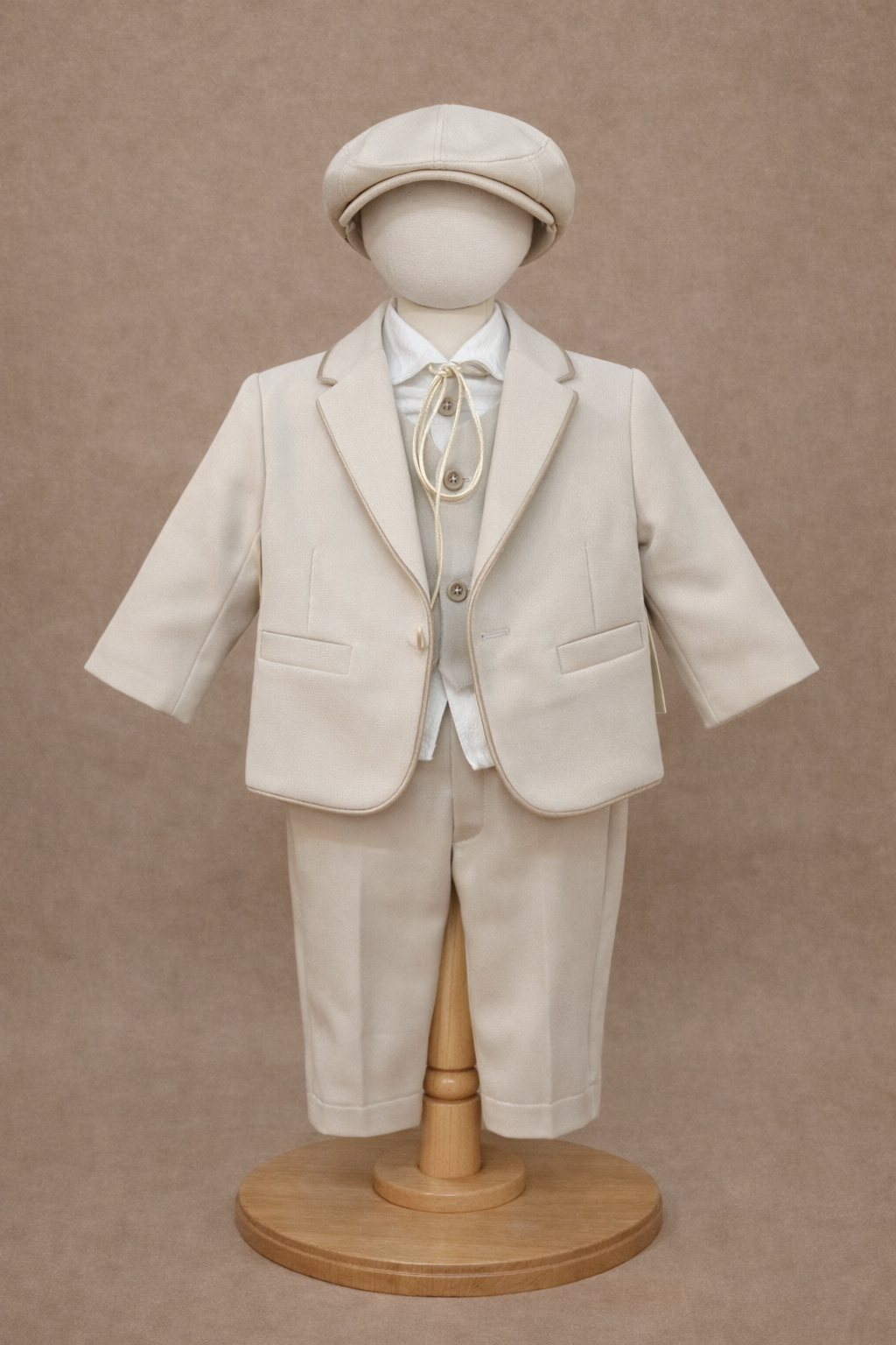 Costum botez baietei compus din sacou, camasa vestuta, pantaloni, papion si basca.