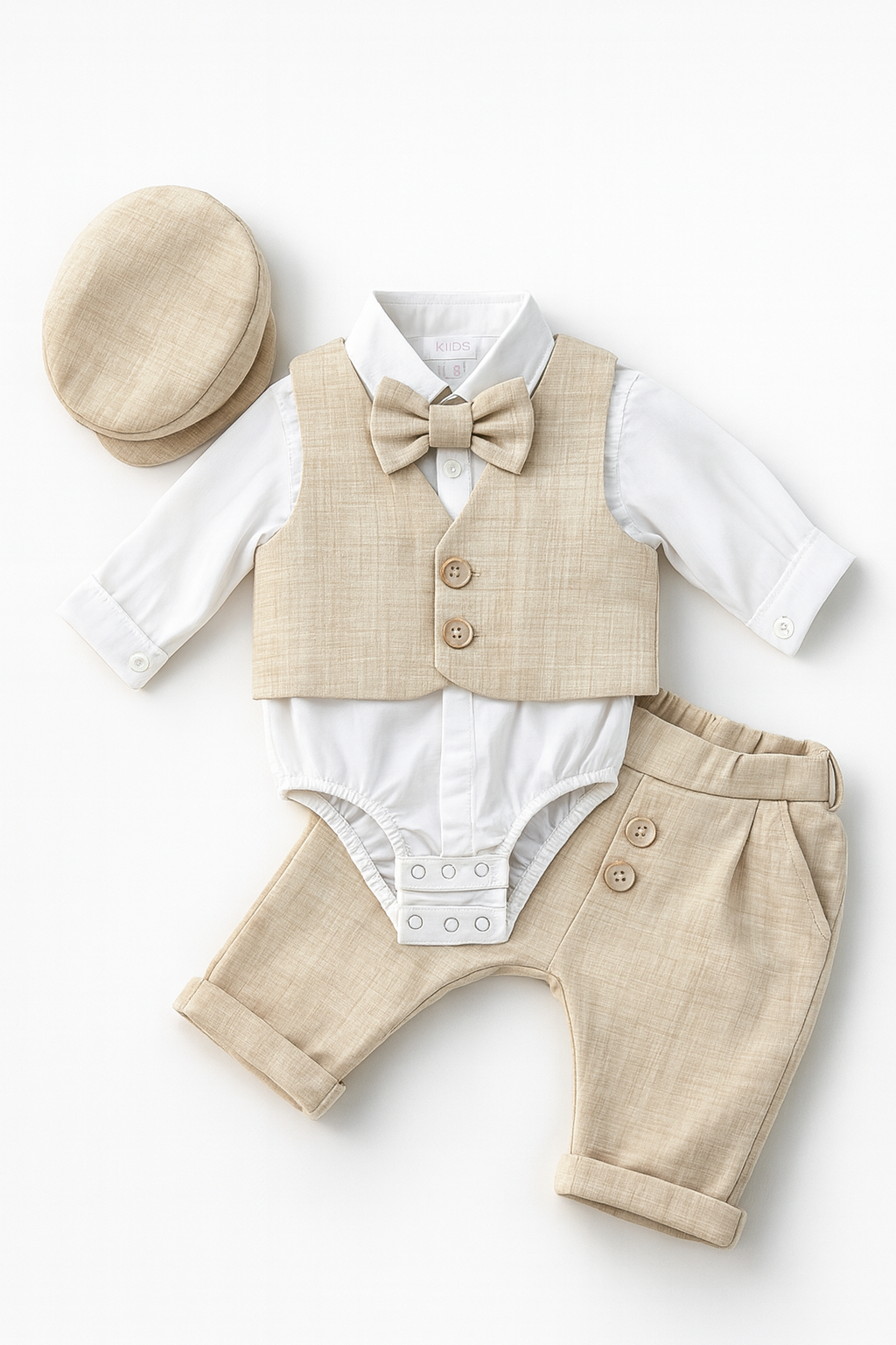 Un outfit adorabil și rafinat pentru micii domni! Acest set elegant pentru băieței este compus dintr-o cămașă alba tip body, pantaloni comozi, vestuta, bascuta si accesoriu final – papionul asortat – completează lookul cu un aer chic și sofisticat.