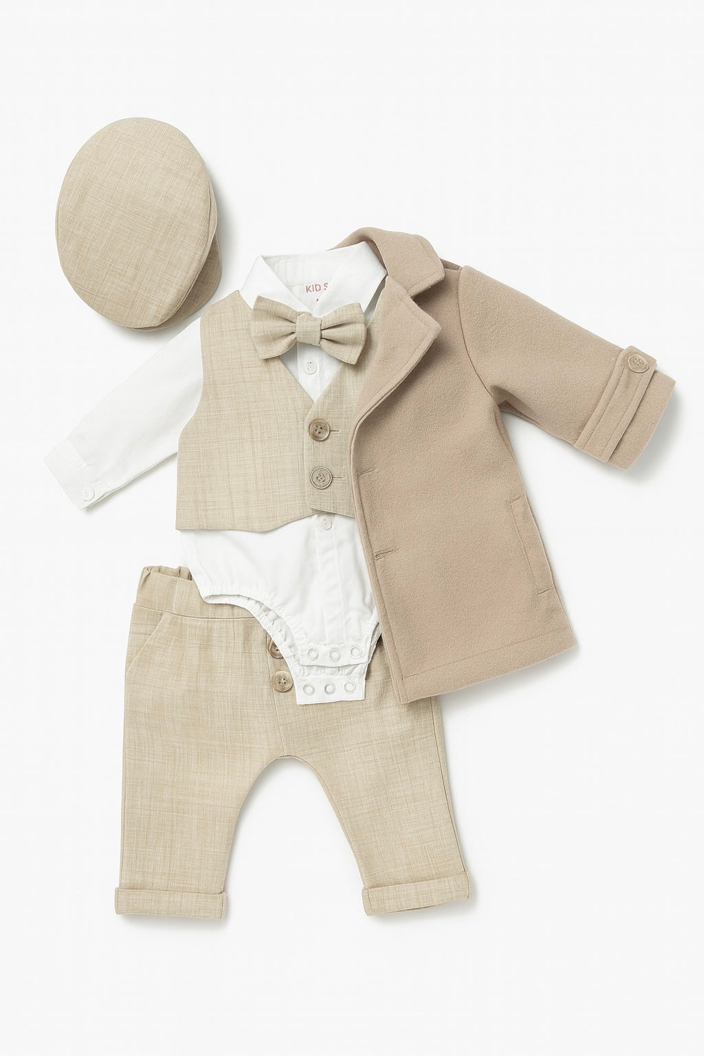 Un outfit adorabil și rafinat pentru micii domni! Acest set elegant pentru băieței este compus dintr-o cămașă alba tip body, pantaloni comozi, vestuta, bascuta, paltonas si accesoriu final – papionul asortat – completează lookul cu un aer chic și sofisticat.