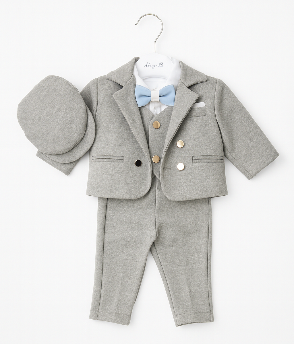Costum compus din sacou din stofa captusit, camasa, vesta, papion si pantaloni si bascuta. Potrivit pentru evenimente precum botez dar nu numai, bebelusul tau va arata exceptional intr-un outfit perfect asortat!