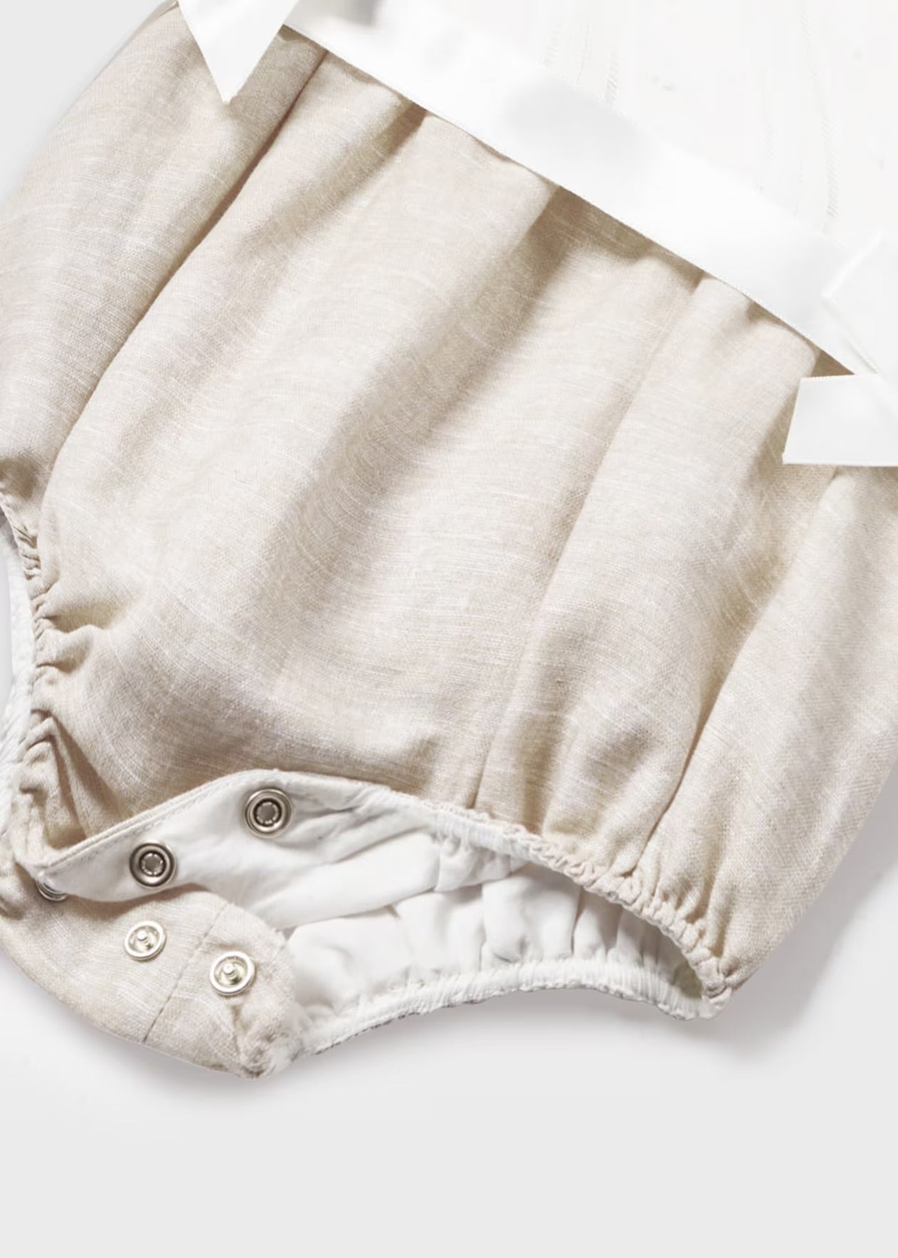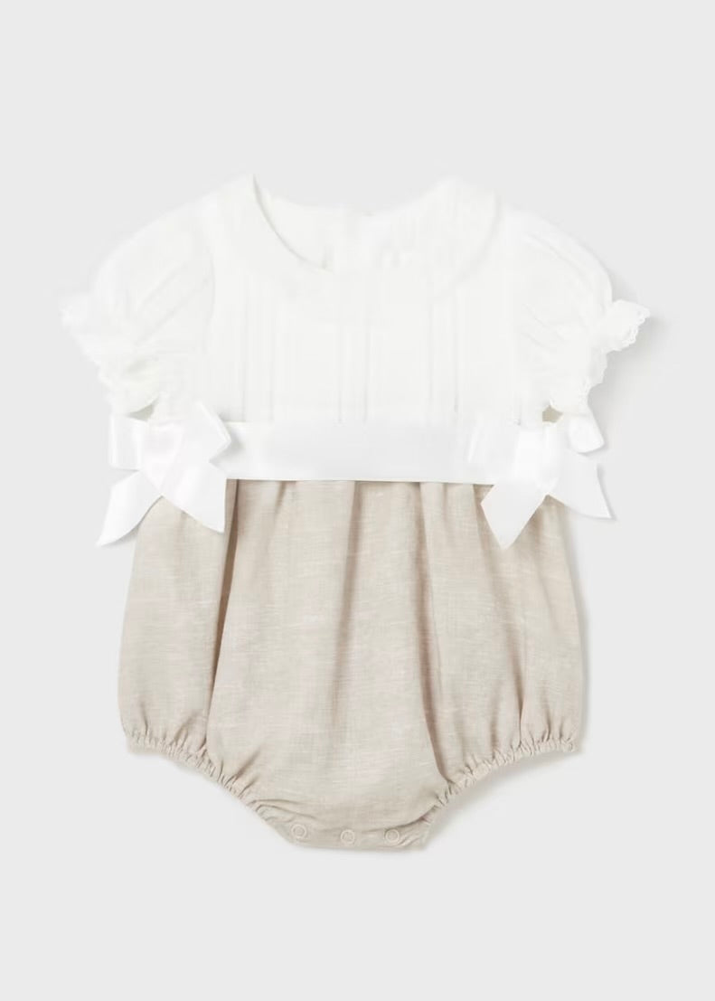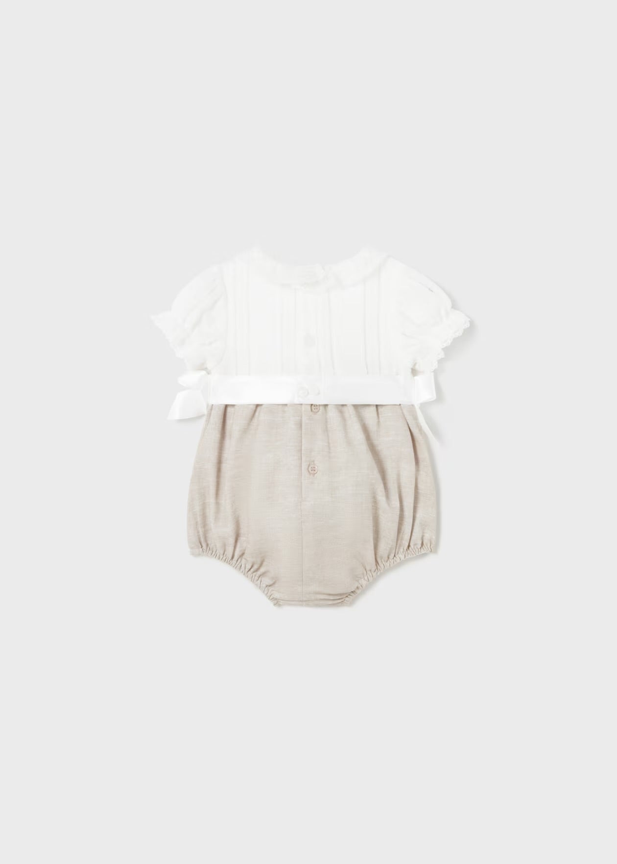 Costumas cu maneca scurta pentru nou-nascut. Guler rotund cu volanas. Capse intre picioare pentru a facilita imbracarea articolului. Inchidere cu nasturi pe spate pentru a facilita punerea. Elemente decorative: aplicatii fundite.