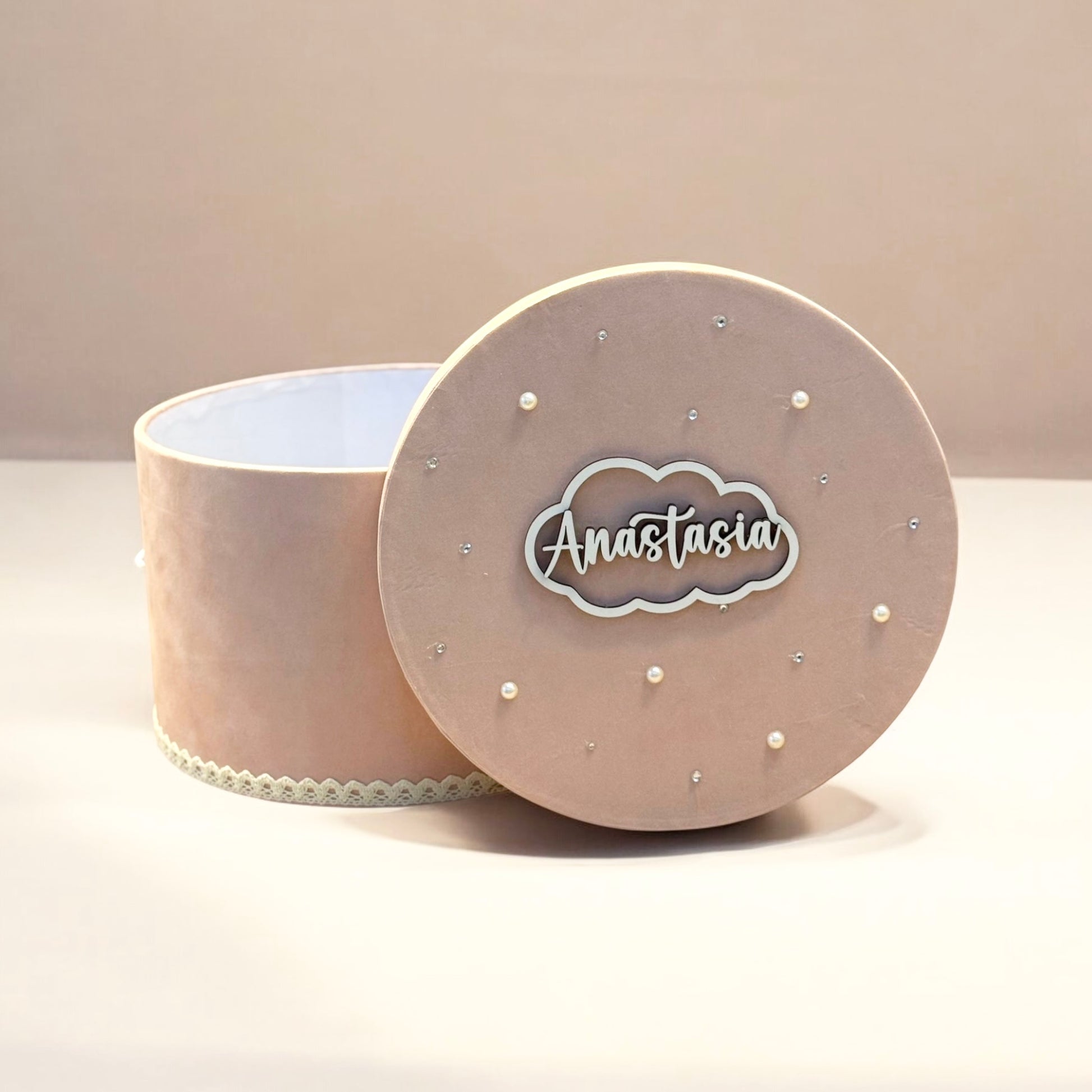 Cufar elegant din carton catifelat, personalizat cu numele bebelusului – perfect pentru trusoul de botez sau ca piesa deosebita pentru pastrarea amintirilor. Designul premium si textura fina transforma acest cufar intr-un accesoriu de efect la orice eveniment.