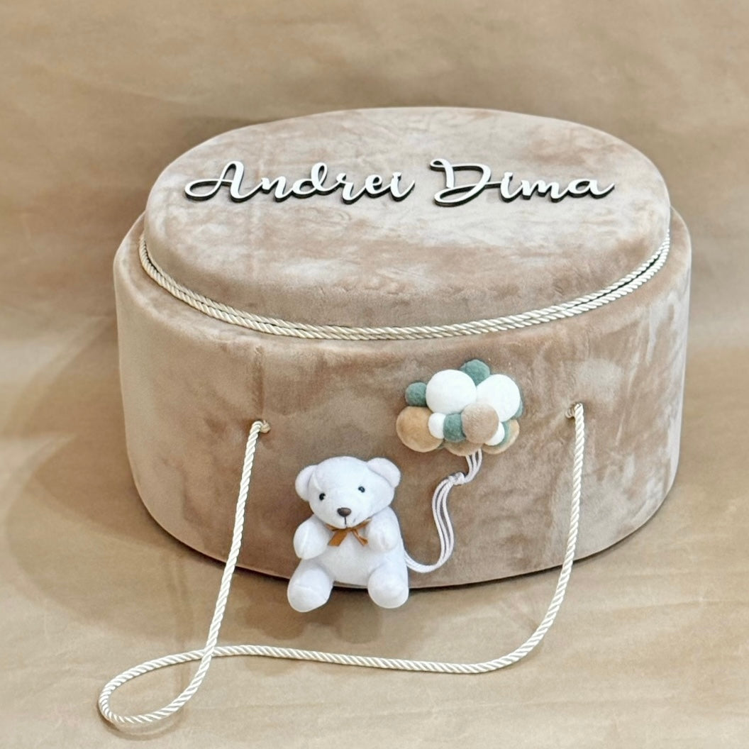 Cufar elegant din catifea, personalizat cu numele bebelusului – perfect pentru trusoul de botez sau ca piesa deosebita pentru pastrarea amintirilor. Designul premium si textura fina transforma acest cufar intr-un accesoriu de efect la orice eveniment.