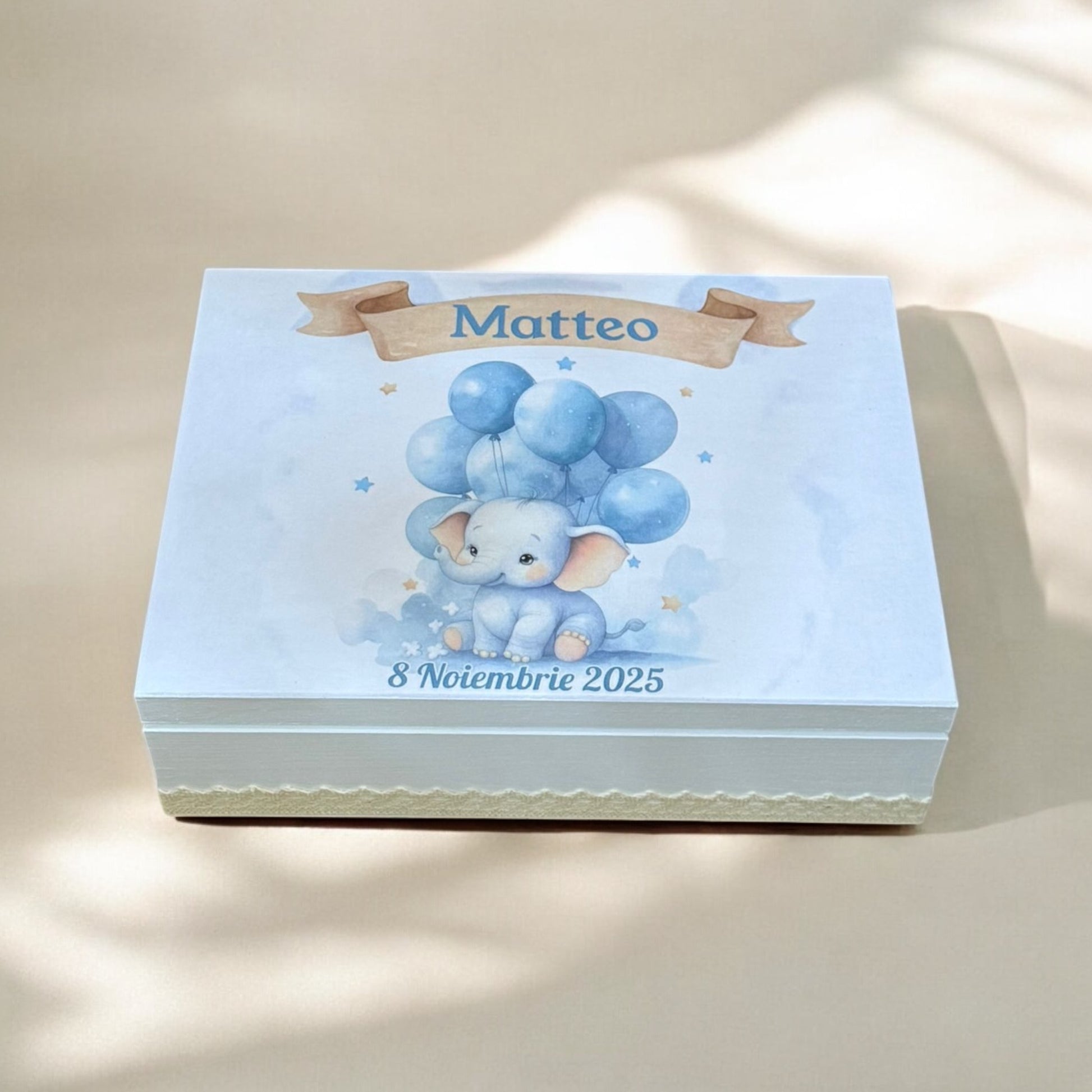 Cufăr din lemn personalizat. Tema din imagine este elefantel. Se poate alege orice imagine sau grafica pentru cufăr