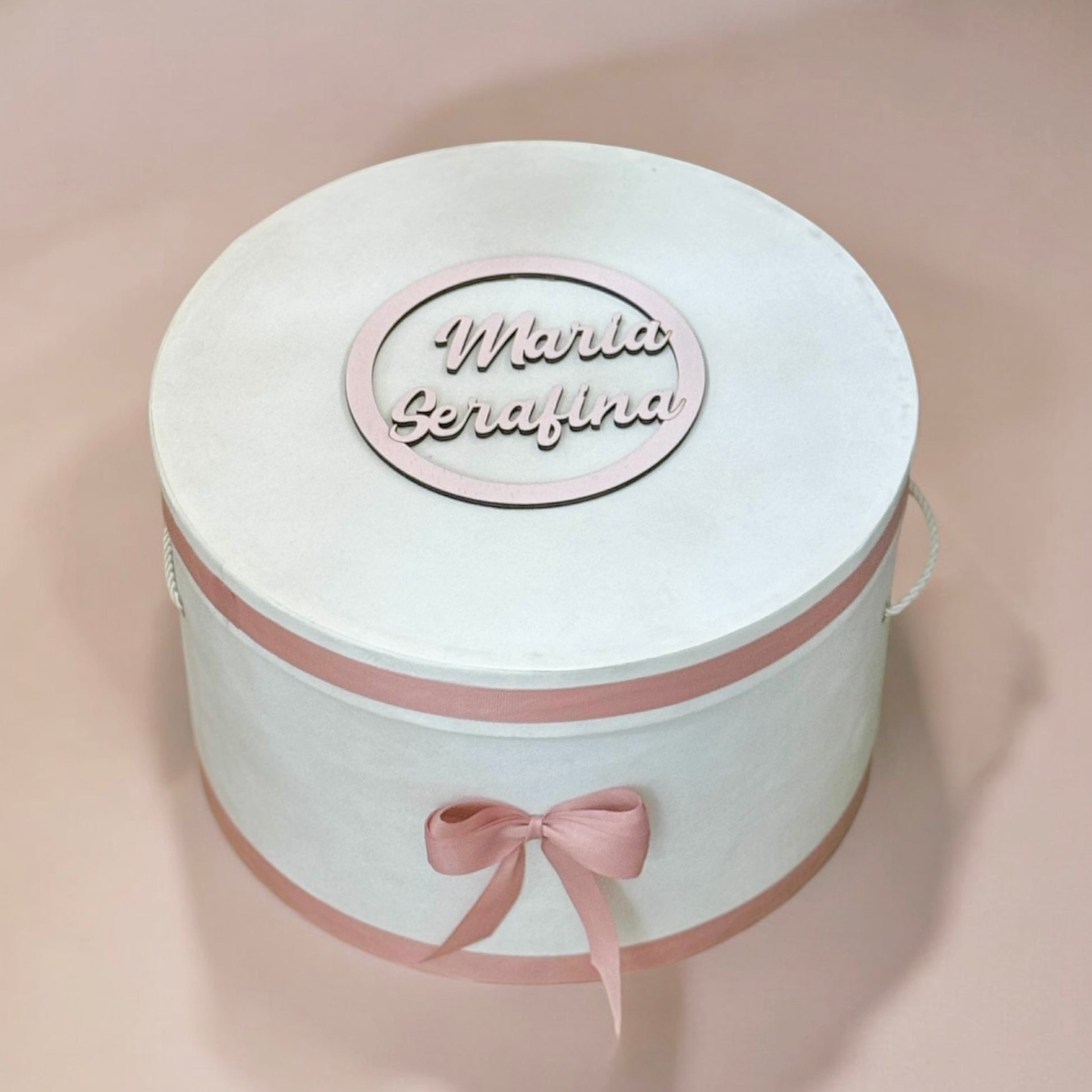 Un cufar elegant din carton catifelat , personalizat cu nume si banda asortata, perfect pentru un cadou special de la nasi. Personalizarea cu numele copilului, inclusa. Potrivit pentru seturi trusou sau amintiri pretioase.