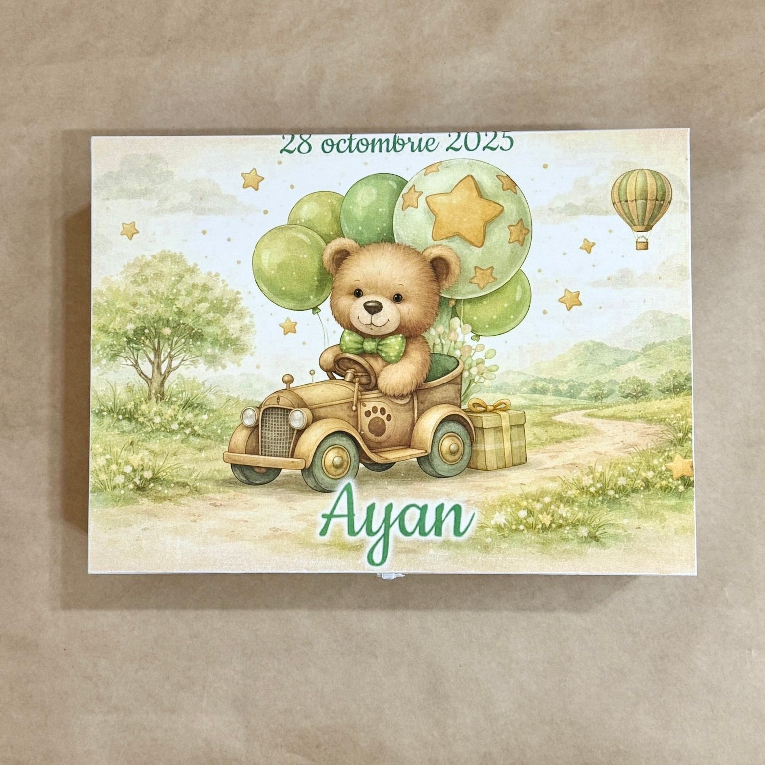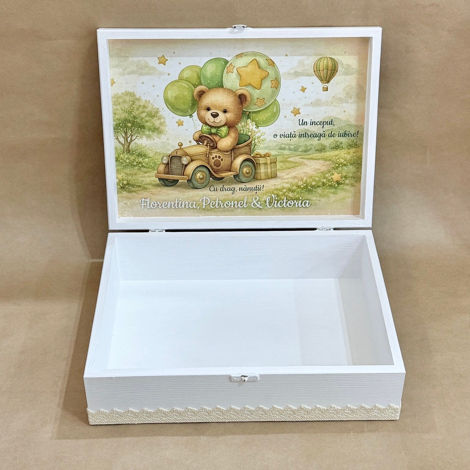 Cufar elegant din lemn, personalizat cu nume, text si grafica la alegere – perfect pentru trusoul de botez sau ca piesa deosebita pentru pastrarea amintirilor. Designul premium si textura fina transforma acest cufar intr-un accesoriu de efect la orice eveniment.