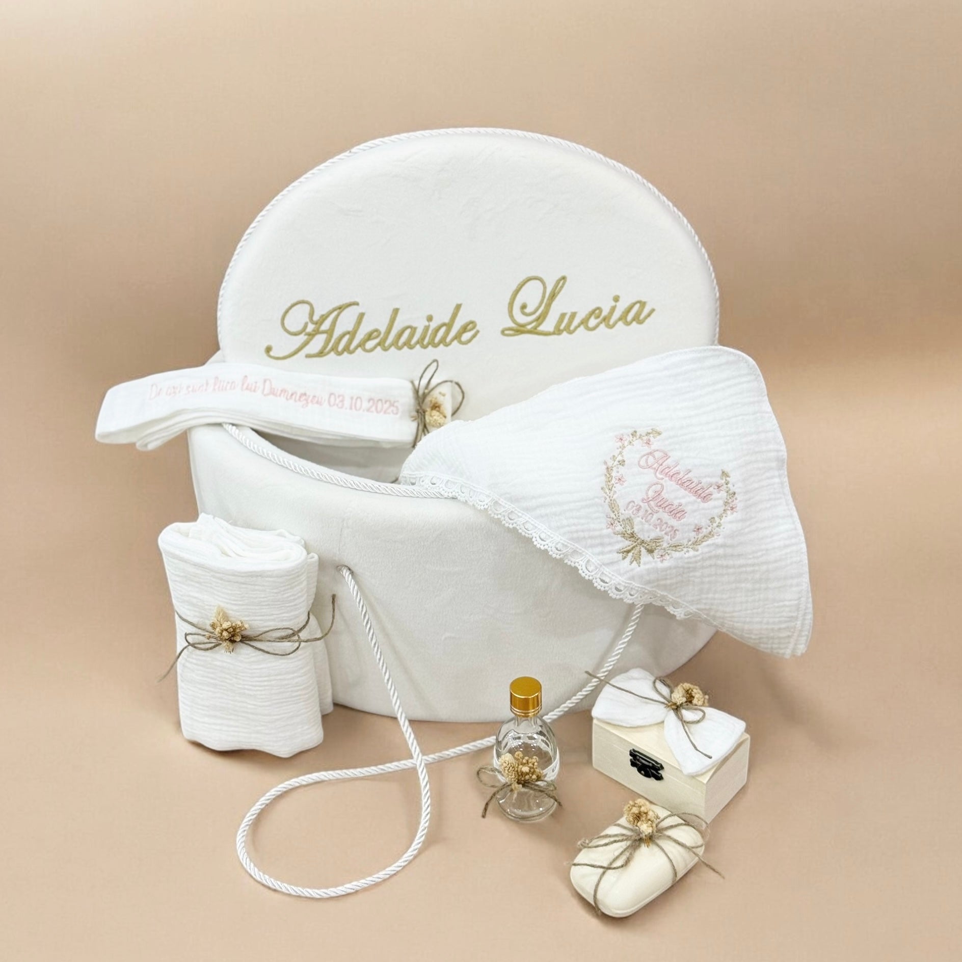 Cufar din catfea cu capac personalizat prin brodare Trusoul este compus din prosop mare, prosop mic, crisma, fasa, sapun, cutie prima suvita, sticluta mir si paturica Trusoul este personalizat cu imaginea si detaliile dorite de catre client.
