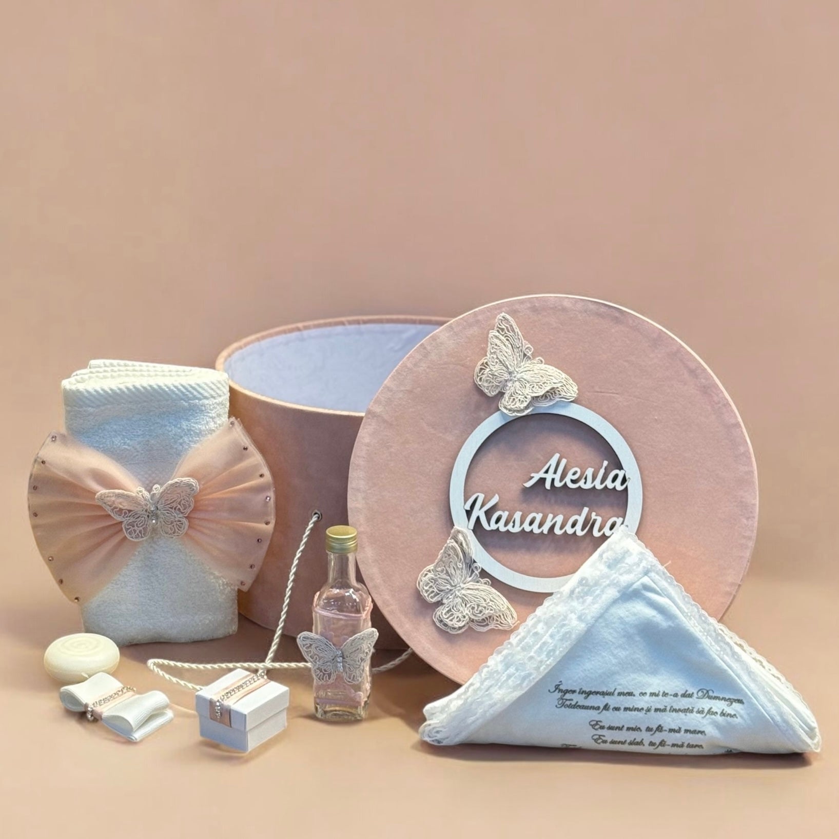 Cufar din carton catifelat cu capac personalizat .Trusoul este compus din prosop mare, prosop mic, crisma, fasa, sapun, cutie prima suvita, sticluta mir si paturica Trusoul nu este personalizat dar se poate personaliza conttacost, cu imaginea si detaliile dorite de catre client