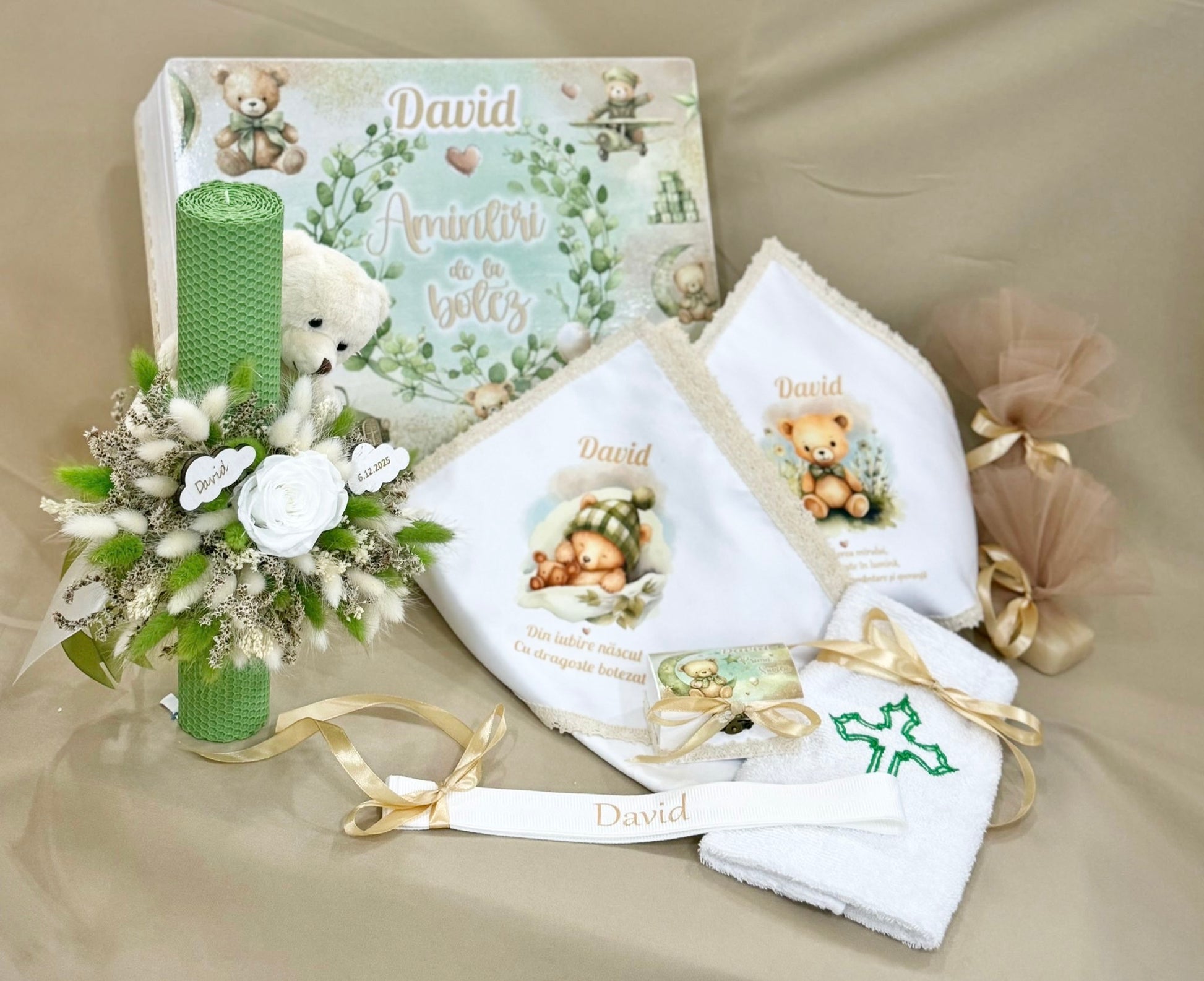 Cufăr mare din lemn personalizat, trusou compus din 7 piese( prosop bebe, prosop preot, panza mir, cutie pentru prima suvita, sticluta mir, sapun pteot si fasa)personalizat . Tema din imagine este ursulet dar se poate alege orice imagine pentru atat pentru cufăr cat si pt trusou.