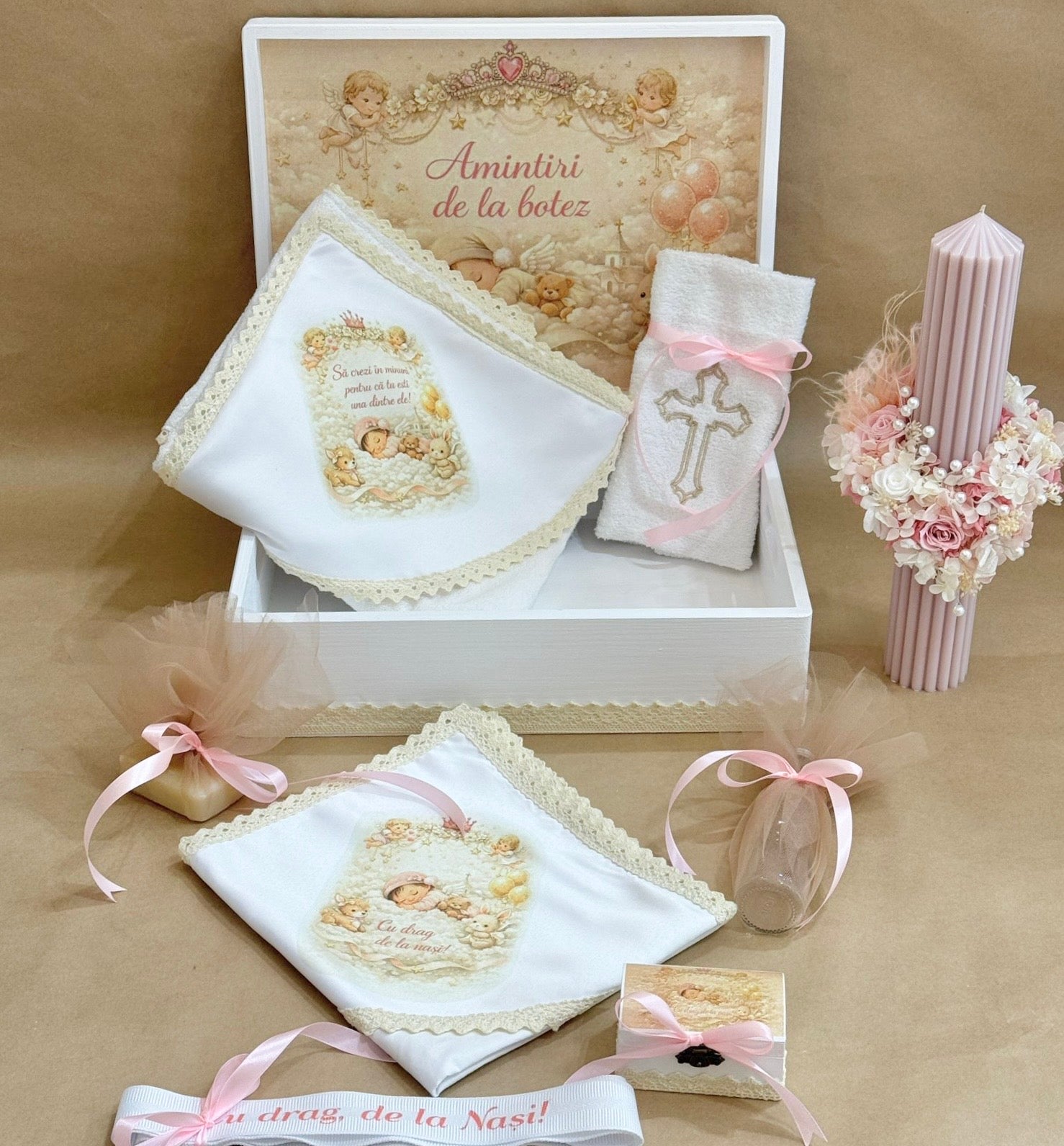 Cufar din lemn printat, trusou din bumbac complet personalizat si lumanare din parafina naturala ornament din flori naturale uscate și criogrnate