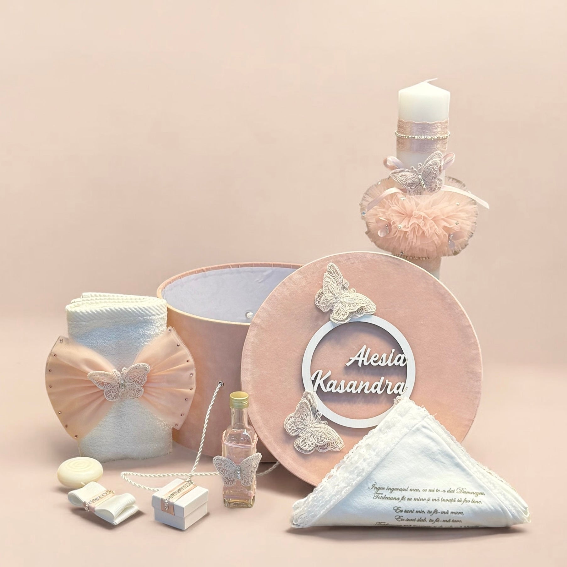 Cufar din carton catifelat cu capac personalizat .Trusoul este compus din prosop mare, prosop mic, crisma, fasa, sapun, cutie prima suvita, sticluta mir si paturica Trusoul nu este personalizat dar se poate personaliza conttacost, cu imaginea si detaliile dorite de catre client