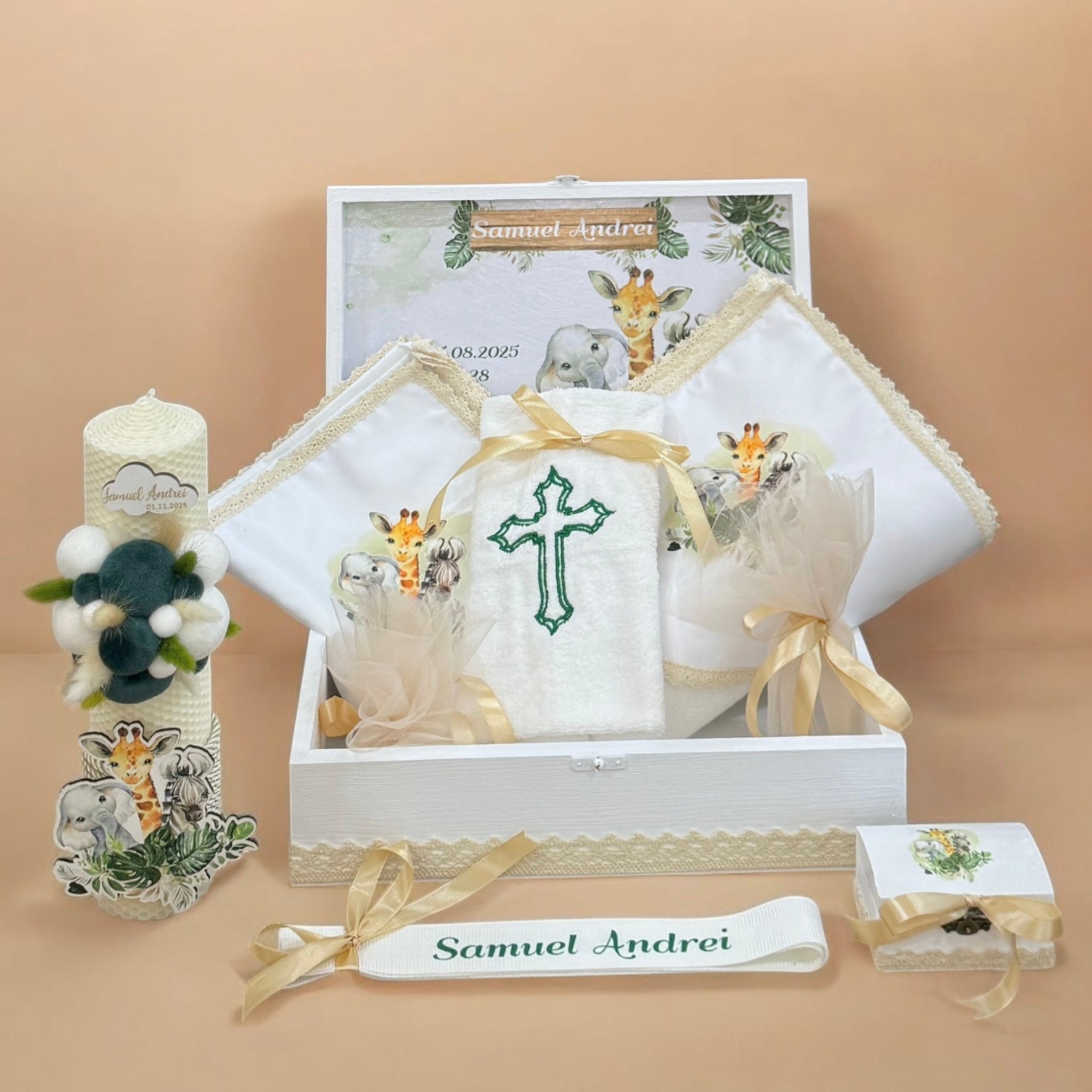 Cufar din lemn cu capac personalizat interior si exterior .Trusoul este compus din prosop mare, prosop mic, crisma, fasa, sapun, cutie prima suvita, sticluta mir . Trusoul este personalizat cu imaginea si detaliile dorite de catre client