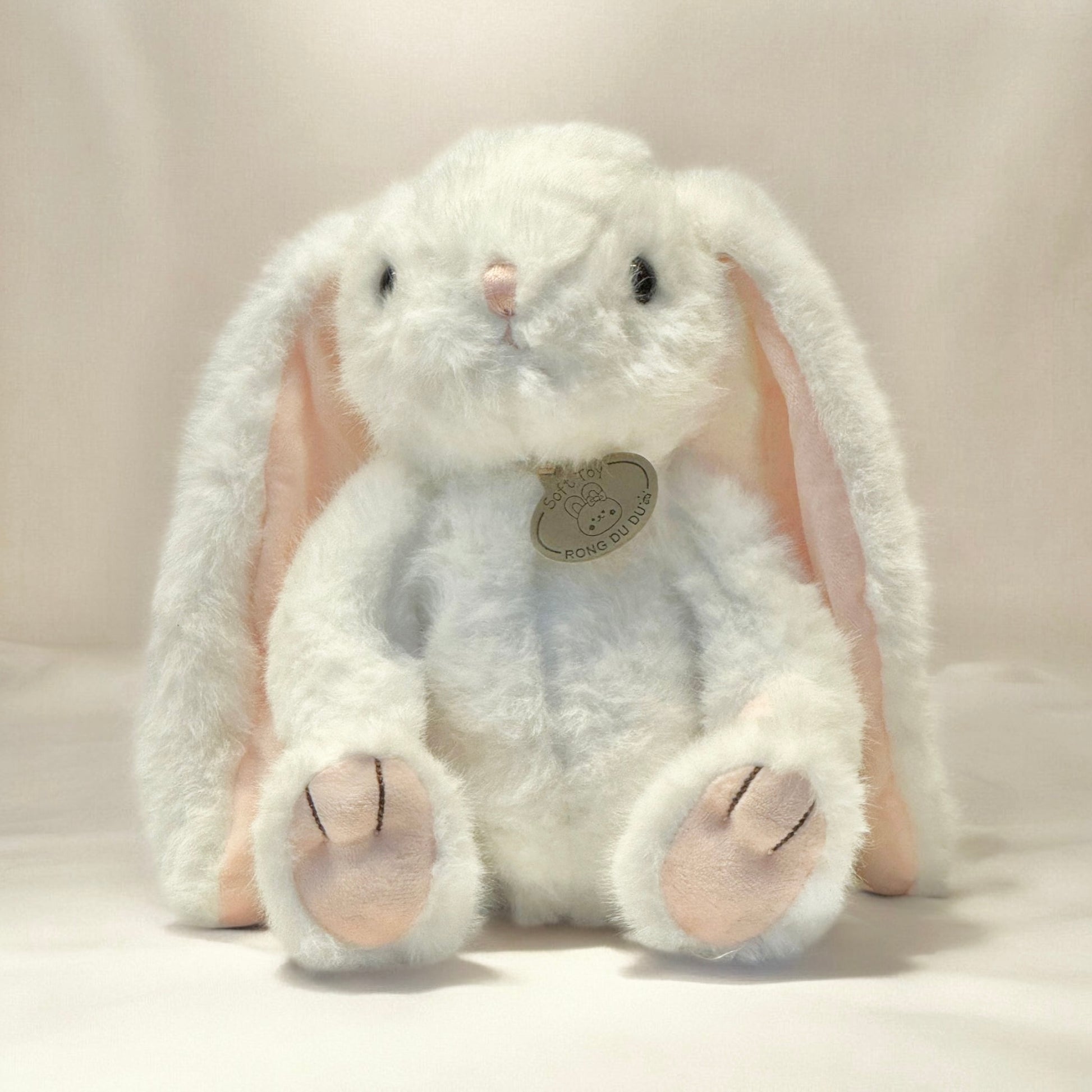 Iepuraș de pluș alb, extrem de fin și delicat, cu urechiușe roz pastel.