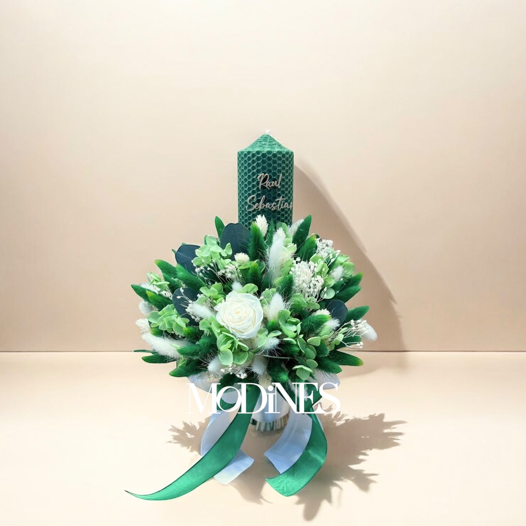 Lumanare pentru botez cu ornament din flori criogenate .Lumanarea este din ceara naturala si ornamentul in fata