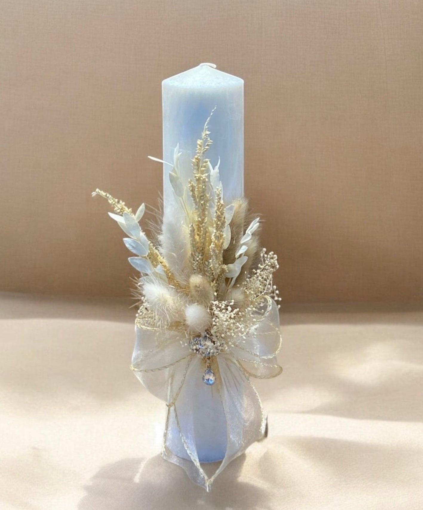 Lumanare botez cu oranament din flori naturale uscate. Personalizare inclusa cadou