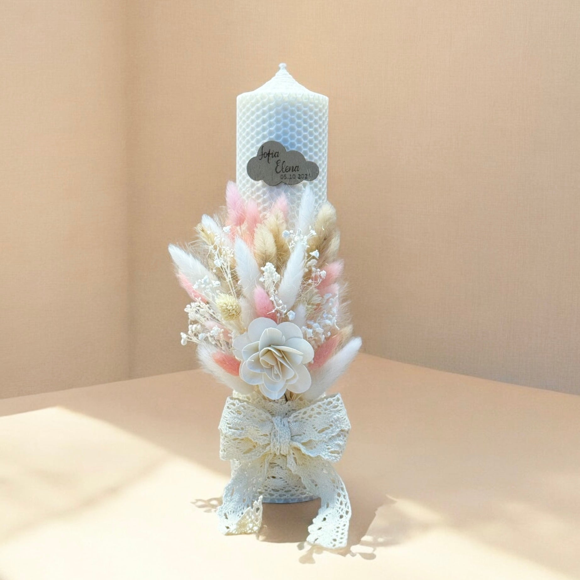 Lumanare botez cu oranament din flori naturale uscate. Personalizare inclusa cadou
