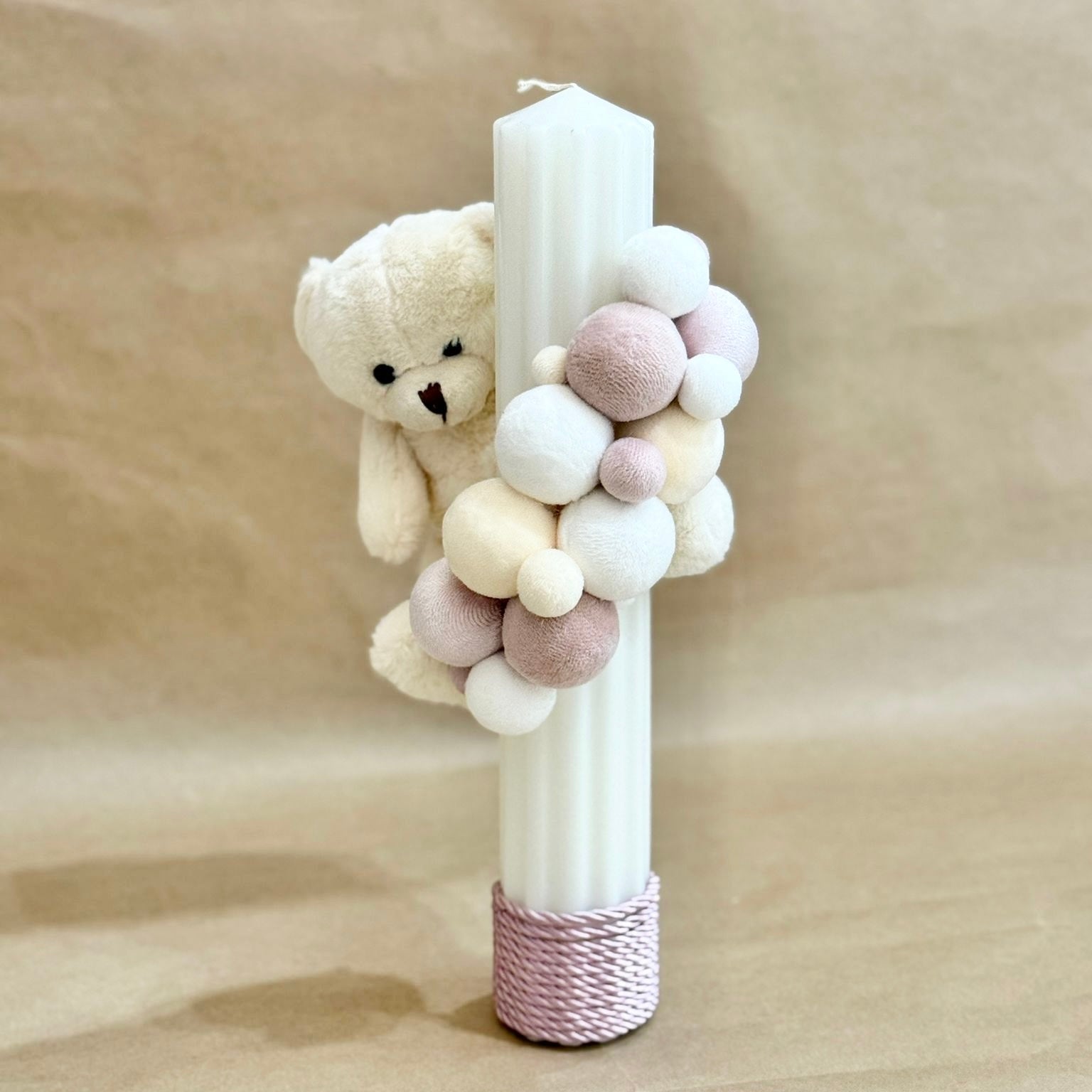 Lumanare pentru botez cu balonase din catifea si ursulet din plus.Lumanarea este din parafina