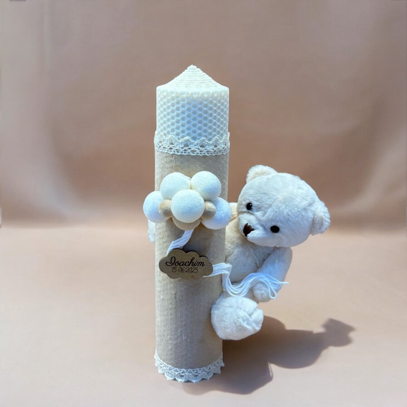 Lumanare pentru botez imbracata in catifea cu balonase din catifea si ursulet din plus.Lumanarea este din ceara naturala si ornamentul in fata