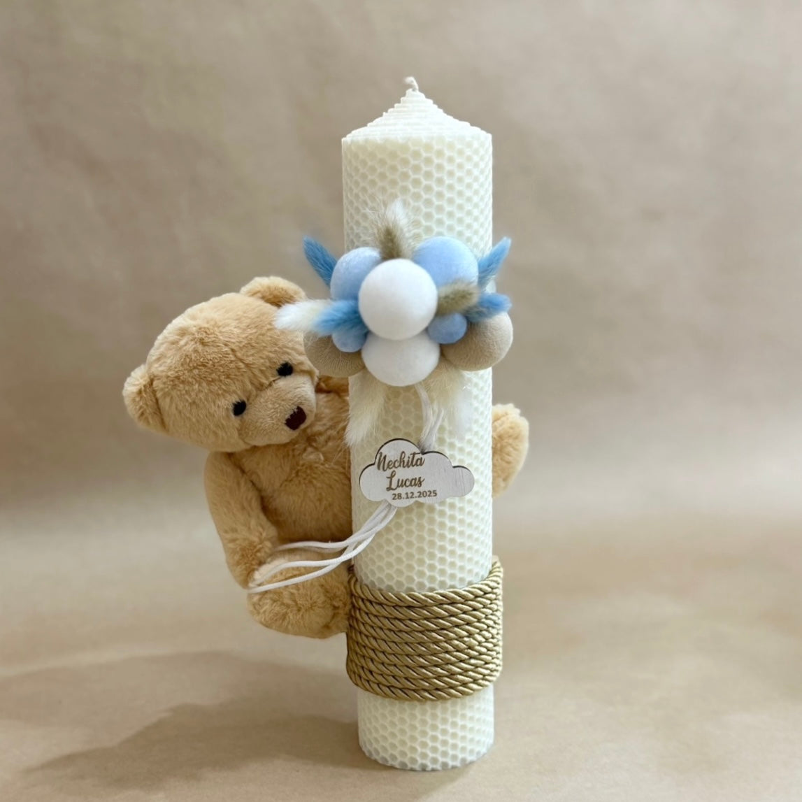 Lumanare botez cu oranament din catifea, balonase din catifea si ursulet din plus.