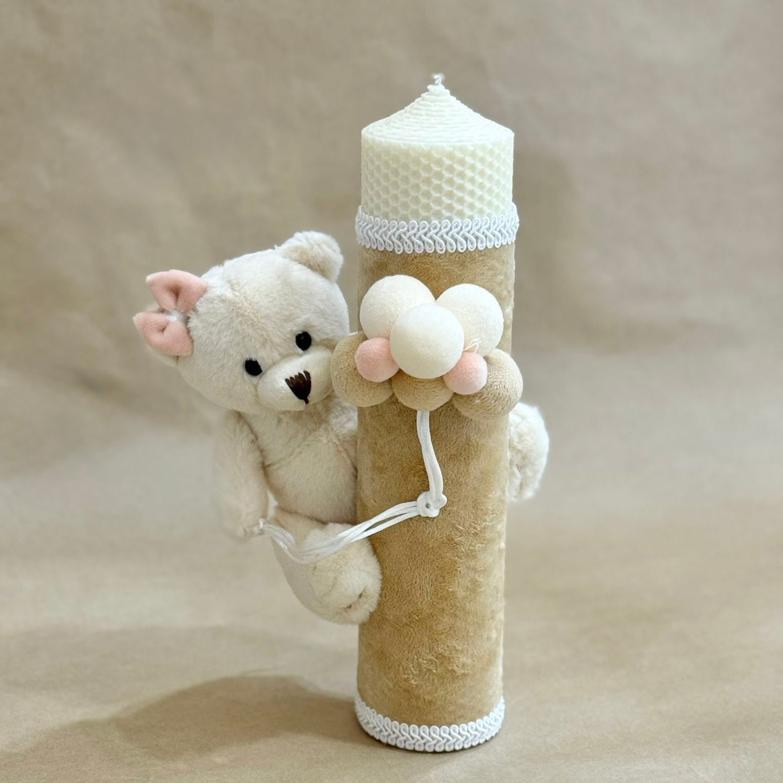 Lumanare botez cu oranament din catifea, balonase din catifea si ursulet din plus.