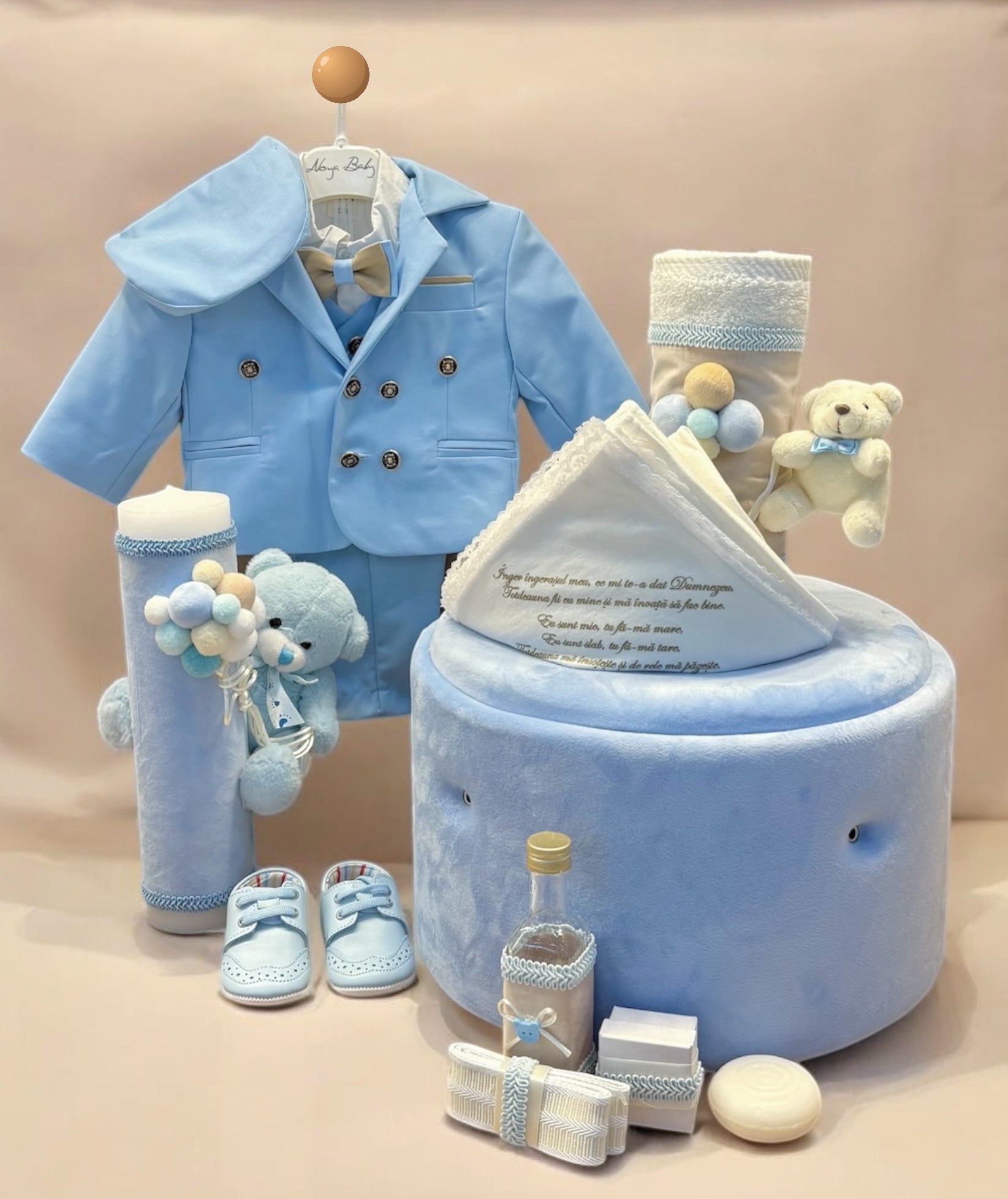 Pentru botezul bebelusului tau este perfect asortat si cu tot ce trebuie pentru un botez fara griji: lumanare, cutie trusou, prosop preot, prosop bebe, crisma, fasa, cutie suvita par, sticluta mir, papucei, bascuta, papion, camasa tip body, vestuta si pantalonI.