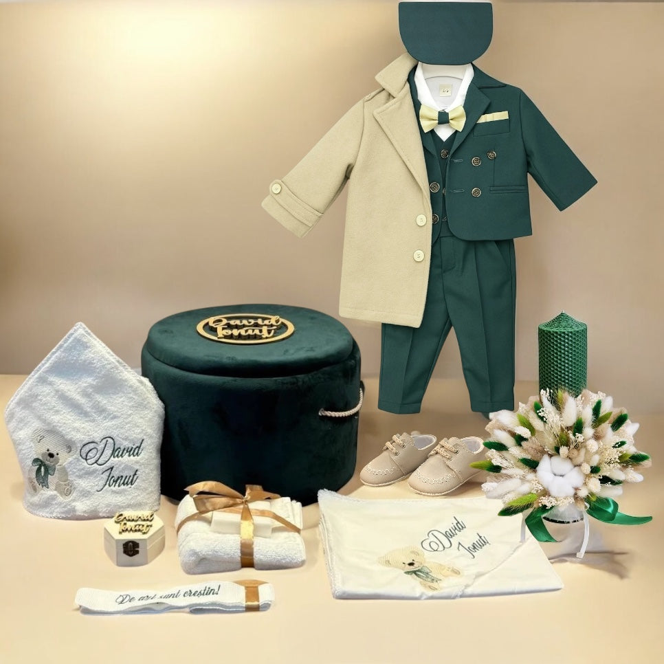 Pentru botezul bebelusului tau este perfect asortat si cu tot ce trebuie pentru un botez fara griji: lumanare, cutie trusou, prosop preot, prosop bebe, crisma, fasa, cutie suvita par, sticluta mir, papucei, bascuta, papion, camasa tip body, vestuta si pantalonI.