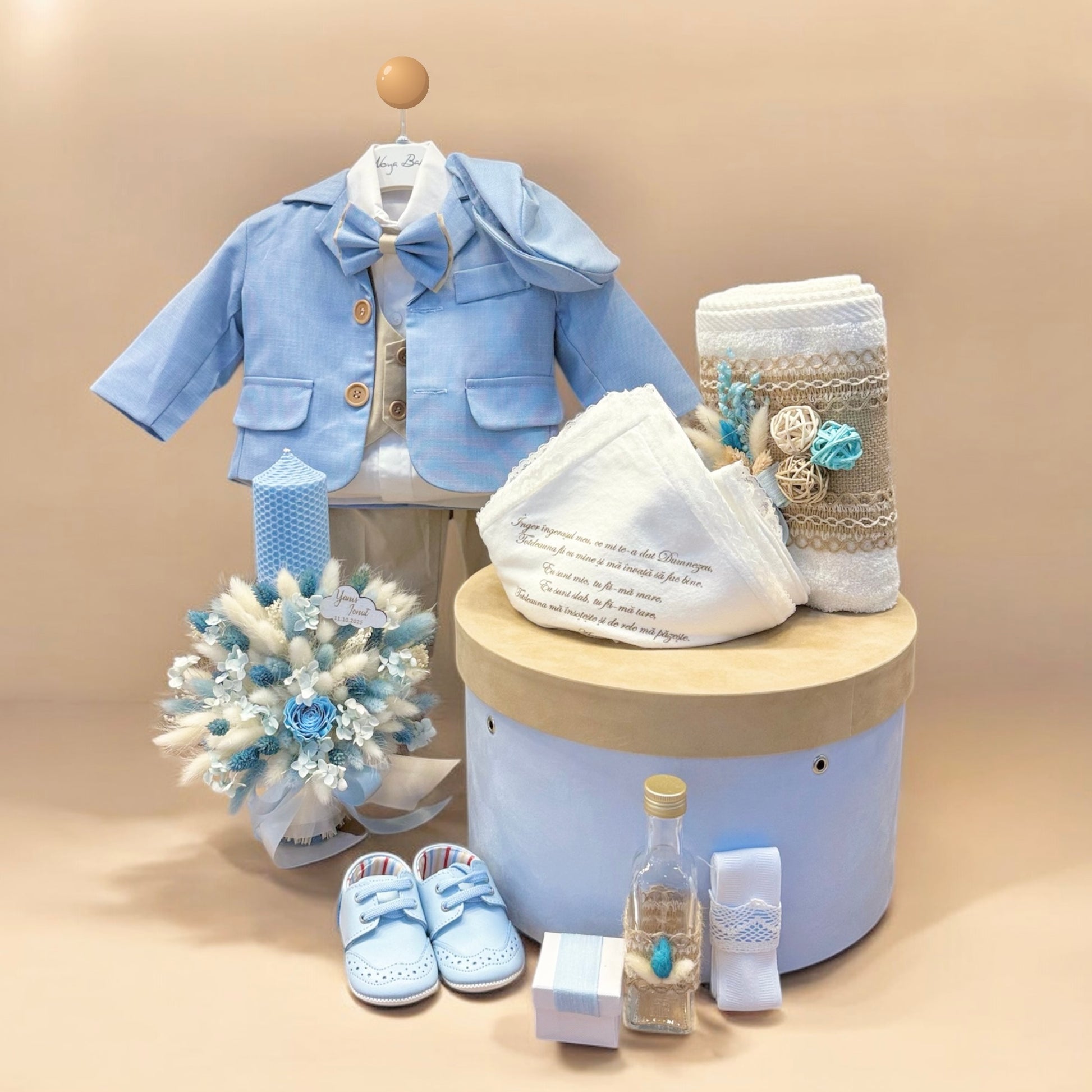 Pentru botezul bebelusului tau este perfect asortat si cu tot ce trebuie pentru un botez fara griji: lumanare, cutie trusou, prosop preot, prosop bebe, crisma, fasa, cutie suvita par, sticluta mir, papucei, bascuta, papion, camasa tip body, vestuta si pantalonI.