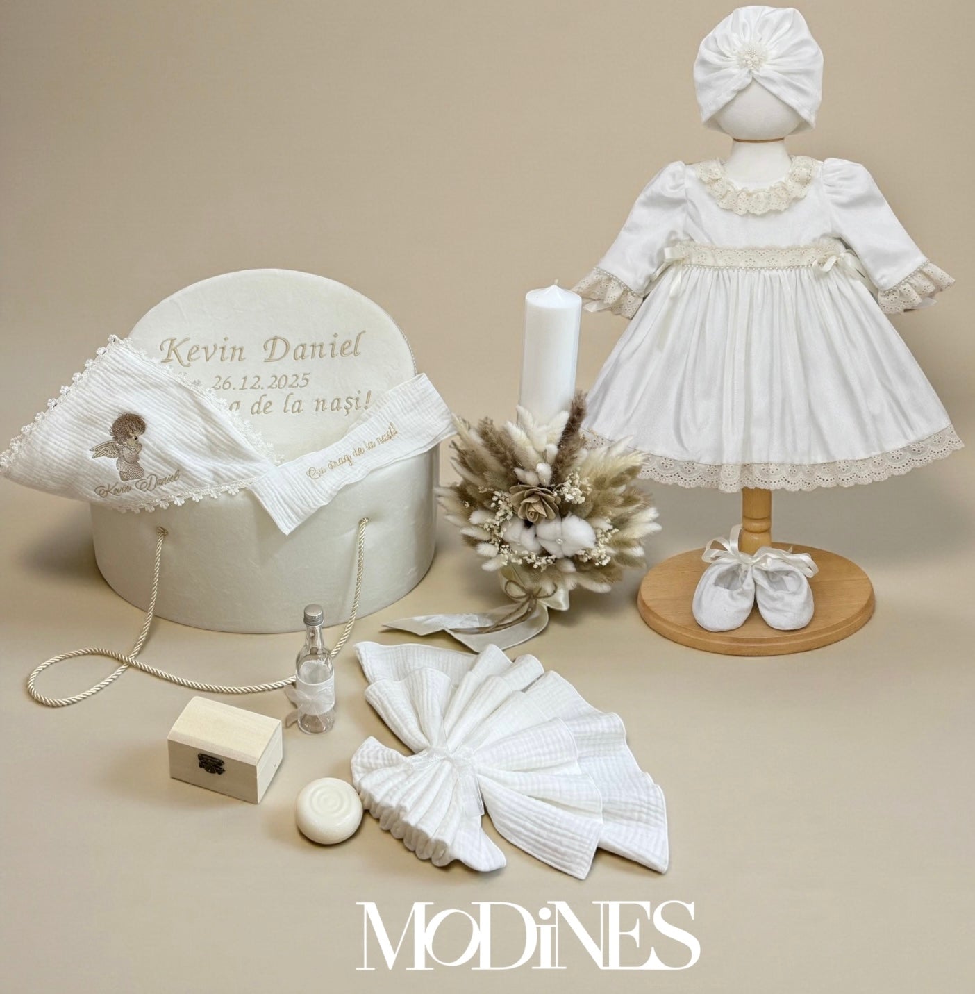 Pachetul complet pentru botezul bebelusului tau este perfect asortat si cu tot ce trebuie pentru un botez fara griji: lumanare, cutie trusou, prosop preot, prosop bebe, crisma, fasa, cutie suvita par, sticluta mir, papucei, turbanel, rochita, dresuri si body