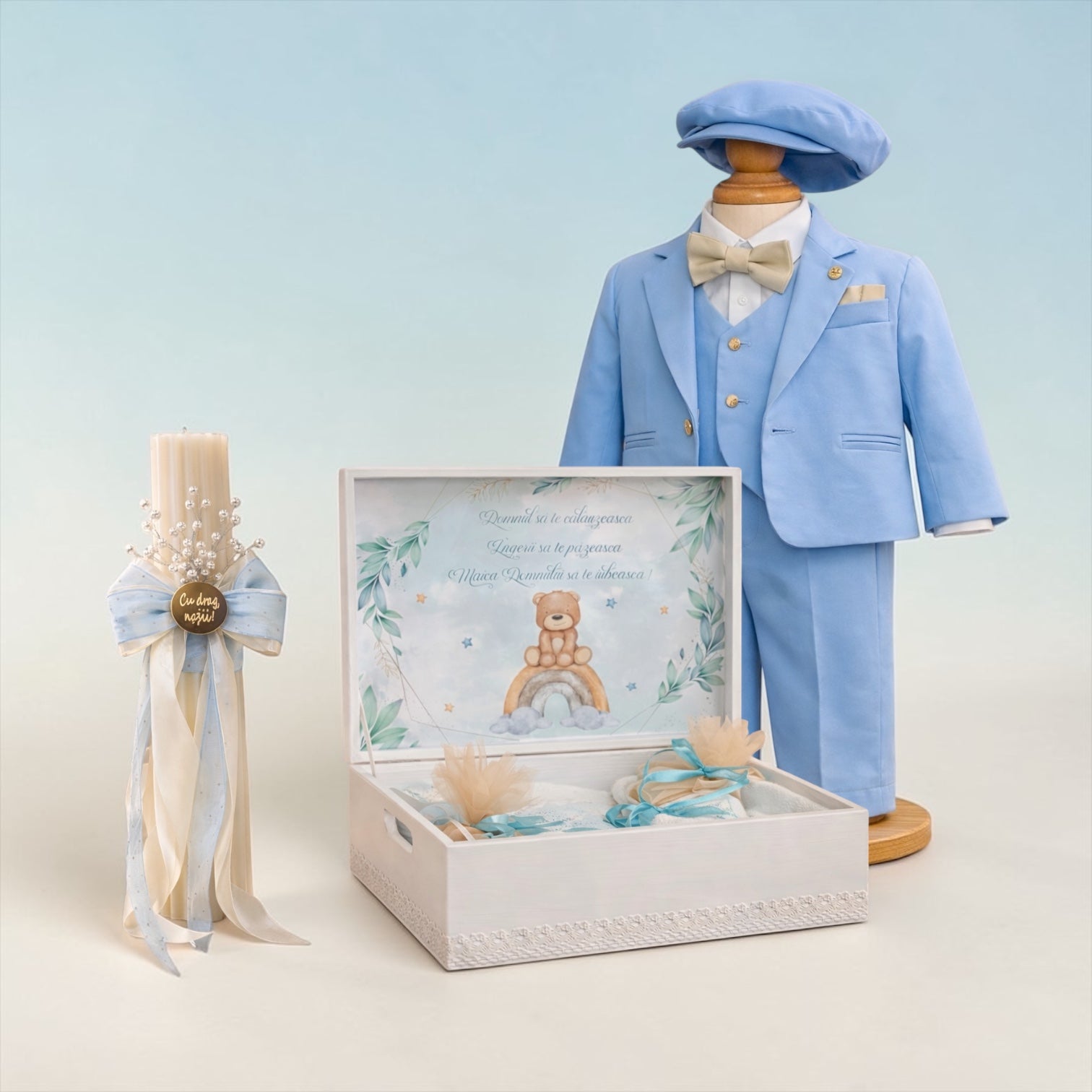 Pachetul complet pentru botezul bebelusului tau este perfect asortat si cu tot ce trebuie pentru un botez fara griji: lumanare, cutie trusou, prosop preot, prosop bebe, crisma, fasa, cutie suvita par, sticluta mir, papucei, bascuta , sacou , vesta, camasa ,pantaloni.