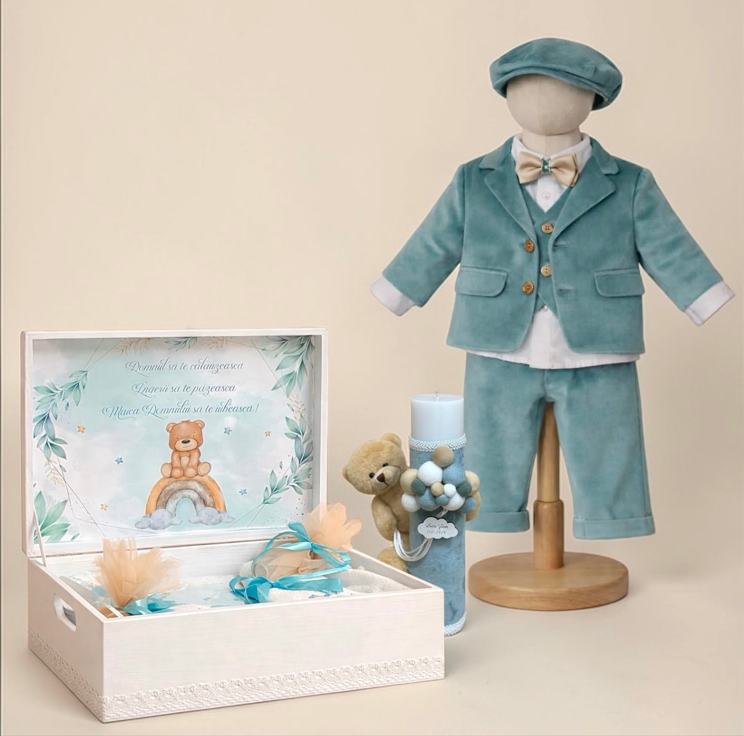 Pachetul complet pentru botezul bebelusului tau este perfect asortat si cu tot ce trebuie pentru un botez fara griji: lumanare, cutie trusou, prosop preot, prosop bebe, crisma, fasa, cutie suvita par, sticluta mir, papucei, bascuta , sacou , vesta, camasa ,pantaloni.