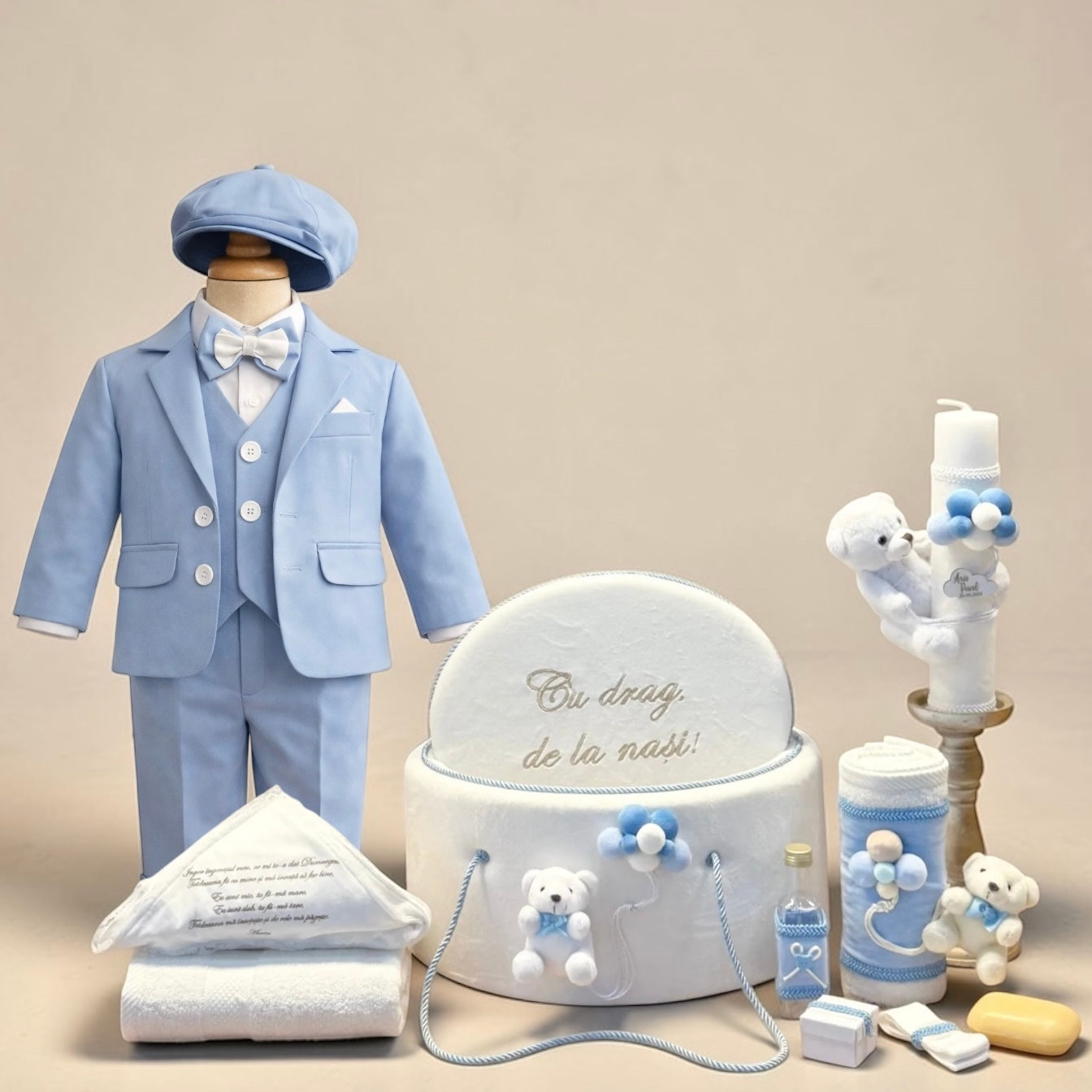 Pachetul complet pentru botezul bebelusului tau este perfect asortat si cu tot ce trebuie pentru un botez fara griji: lumanare, cutie trusou, prosop preot, prosop bebe, crisma, fasa, cutie suvita par, sticluta mir, papucei, bascuta , sacou , vesta, camasa ,pantaloni.