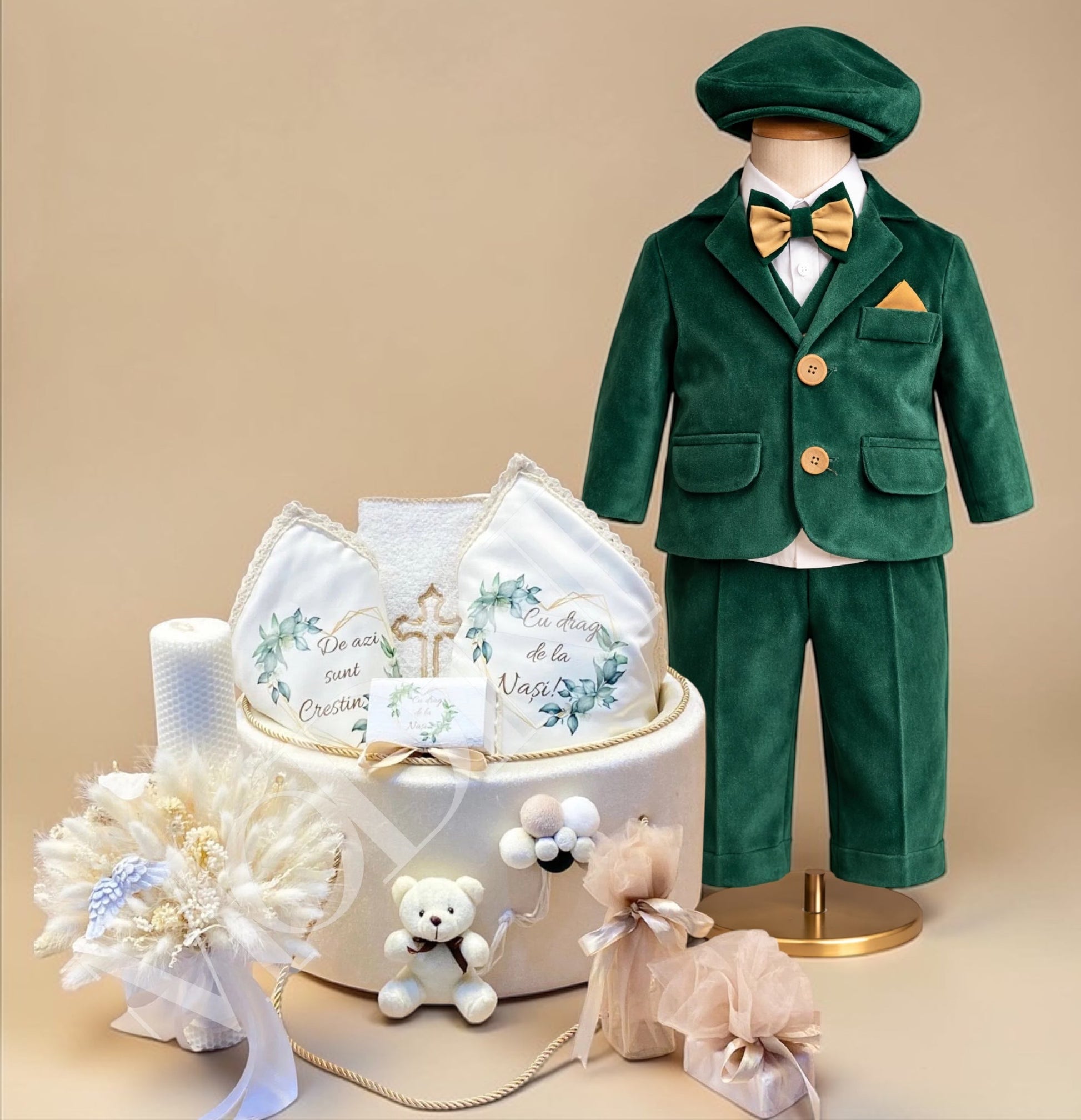Pachetul complet pentru botezul bebelusului tau este perfect asortat si cu tot ce trebuie pentru un botez fara griji: lumanare, cutie trusou, prosop preot, prosop bebe, crisma, fasa, cutie suvita par, sticluta mir, papucei, bascuta , sacou , vesta, camasa ,pantaloni.