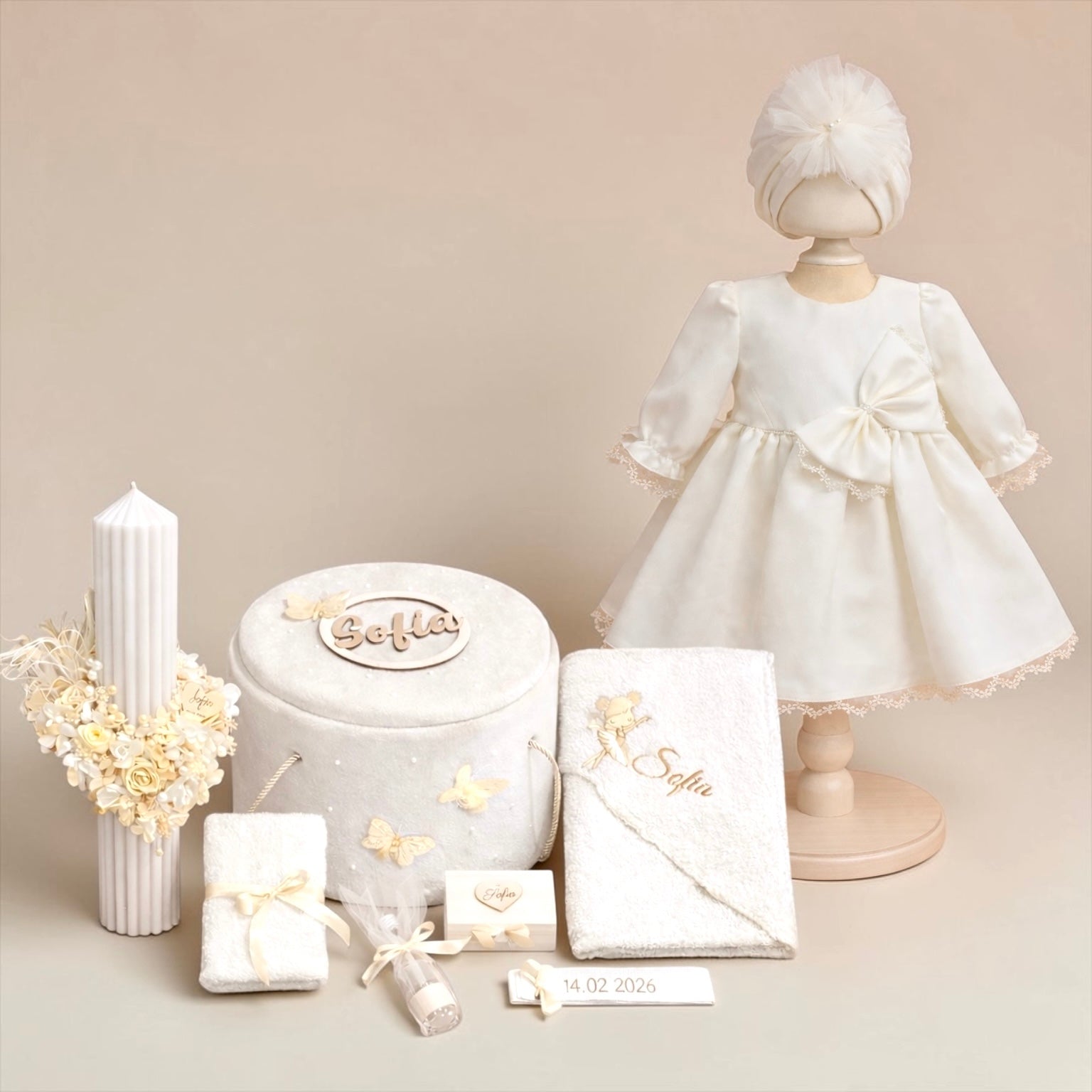 Pachetul complet pentru botezul bebelusului tau este perfect asortat si cu tot ce trebuie pentru un botez fara griji: lumanare, cutie trusou, prosop preot, prosop bebe, crisma, fasa, cutie suvita par, sticluta mir, papucei, turbanel, rochita, dresuri si body