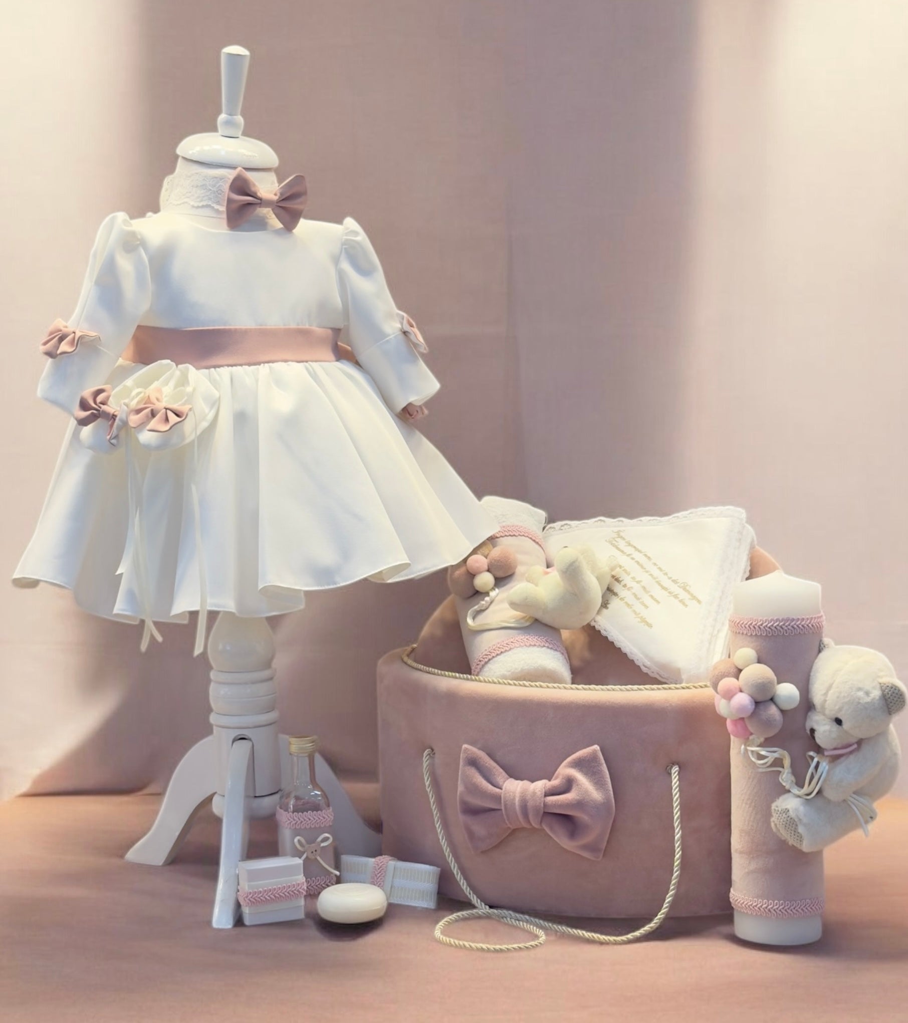 Pachetul contine : rochita, turban, balerini, dresuri, body, trusou complet, cutie trusou si lumanare