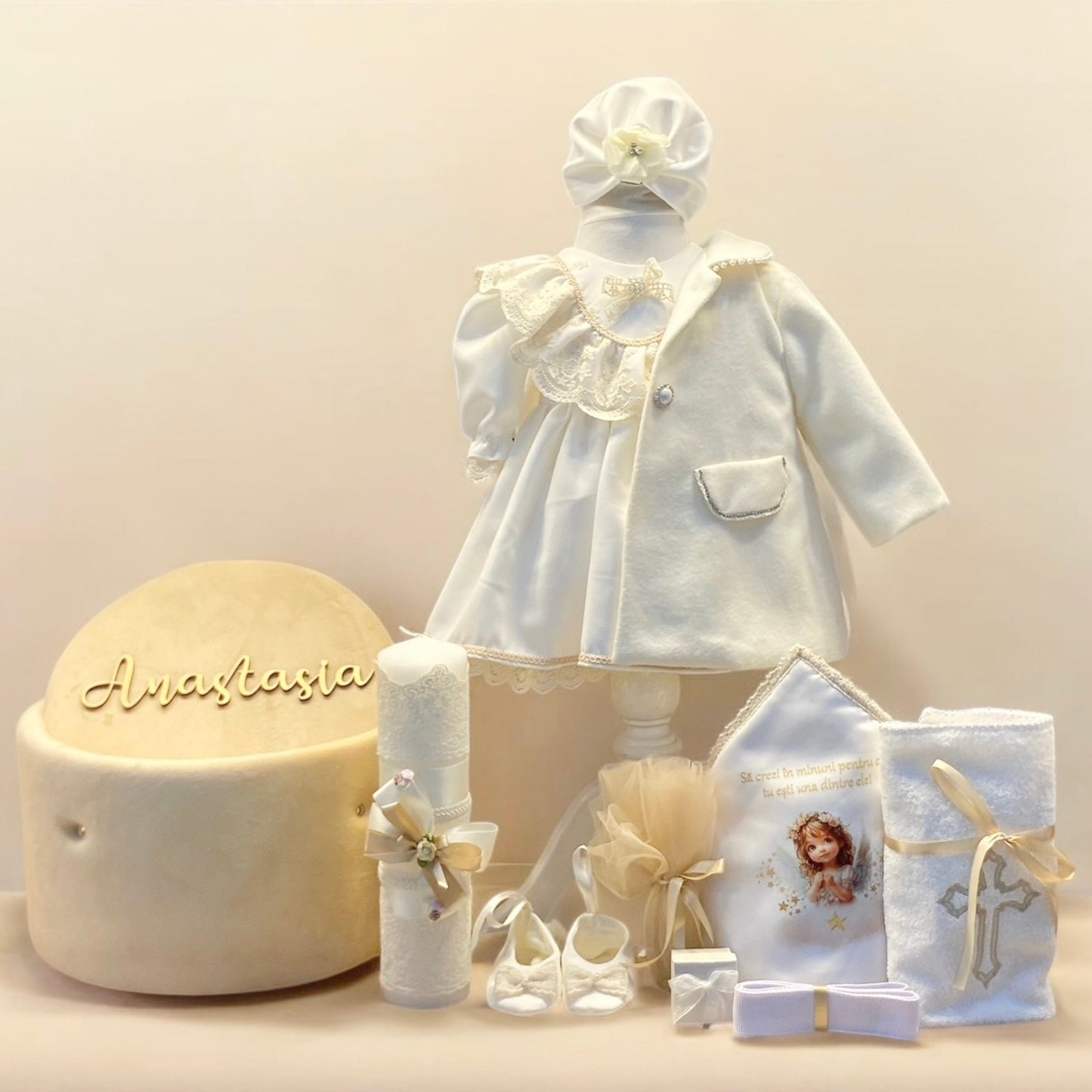 Pachetul contine : blanita sau paltonas, rochita, turban, balerini, dresuri, body, trusou complet, cutie trusou si lumanare