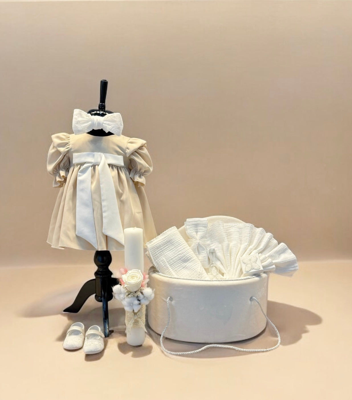 Pachetul contine : rochita, bentita, balerini, dresuri, body, trusou complet, cutie trusou si lumanare