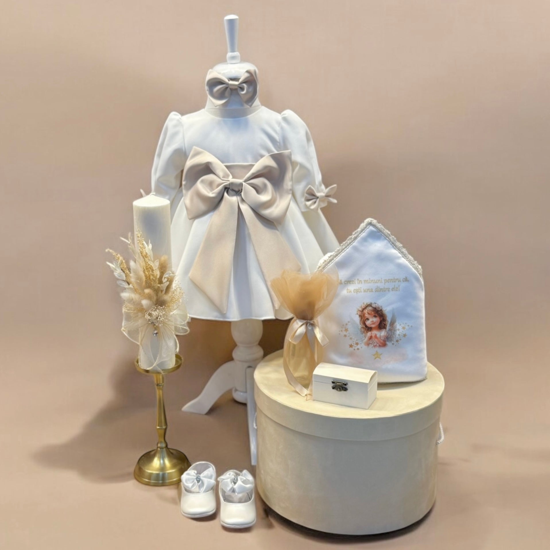 Pachetul contine : rochita, bentita, balerini, dresuri, body, trusou complet, cutie trusou si lumanare
