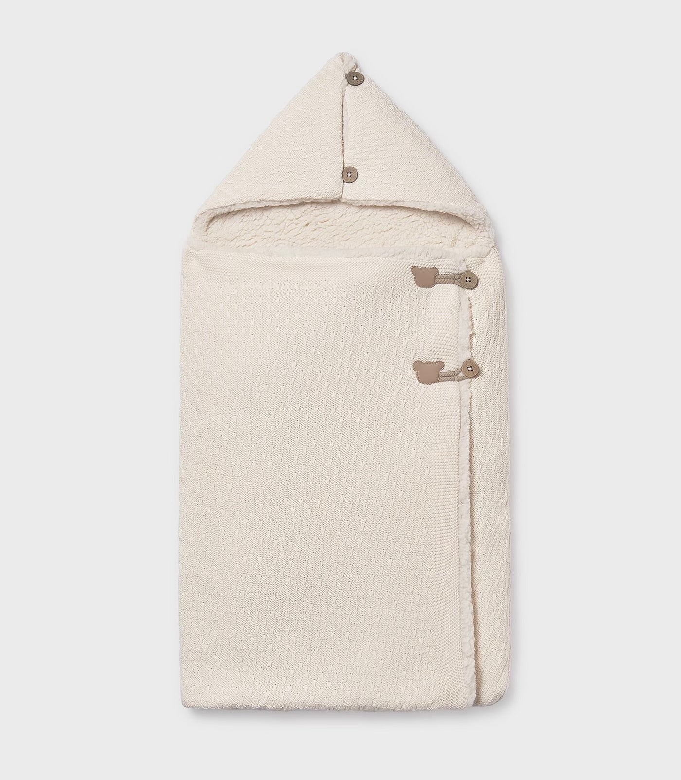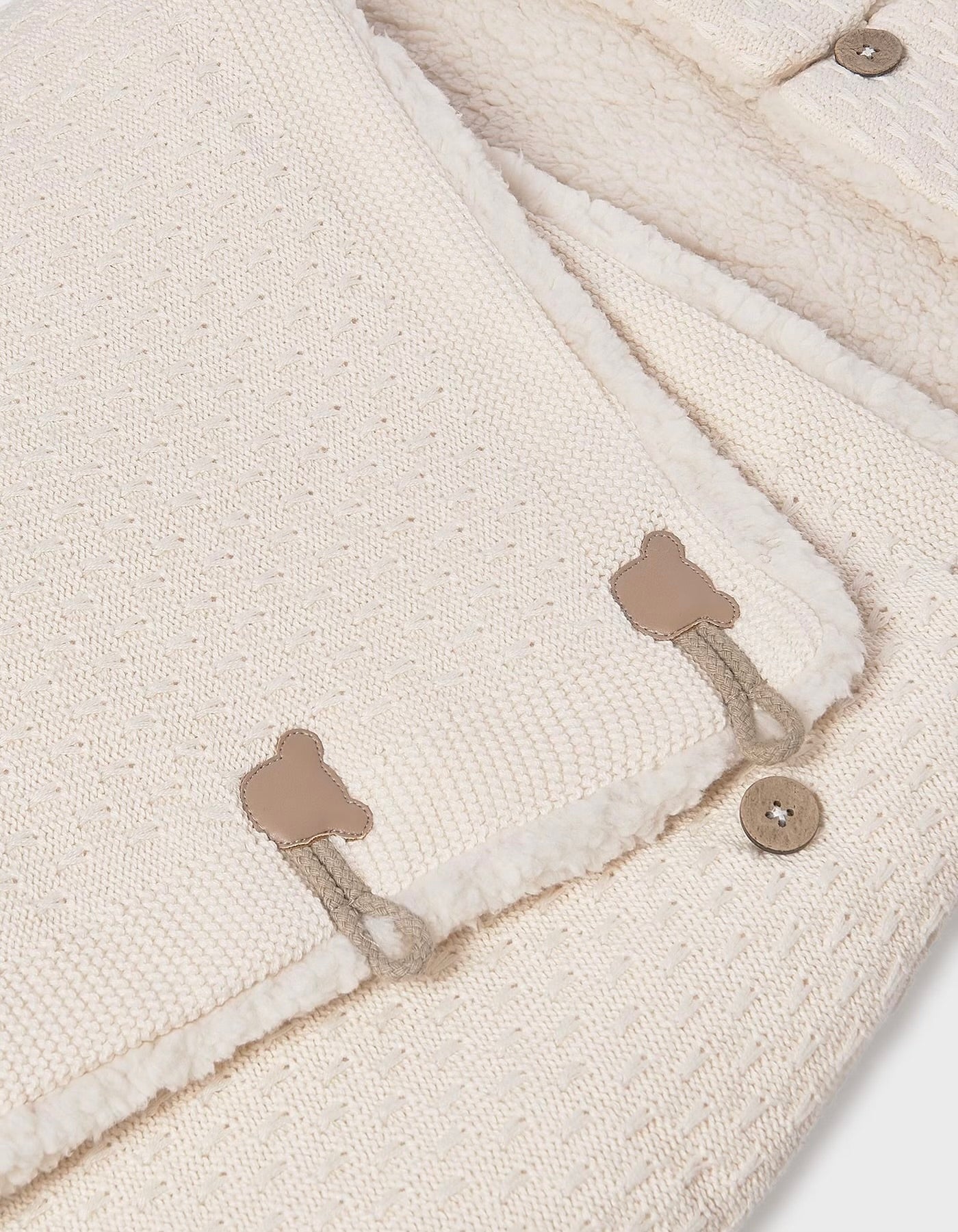 Sac pentru carucior, moale si placut la atingere. Conceput pentru a proteja bebelusul nou-nascut si pentru a se adapta oricarui tip de carucior. Inchidere laterala cu nasturi. Tesatura tricotata, moale si placuta la atingere. Corp interior captusit cu blana fina si moale.