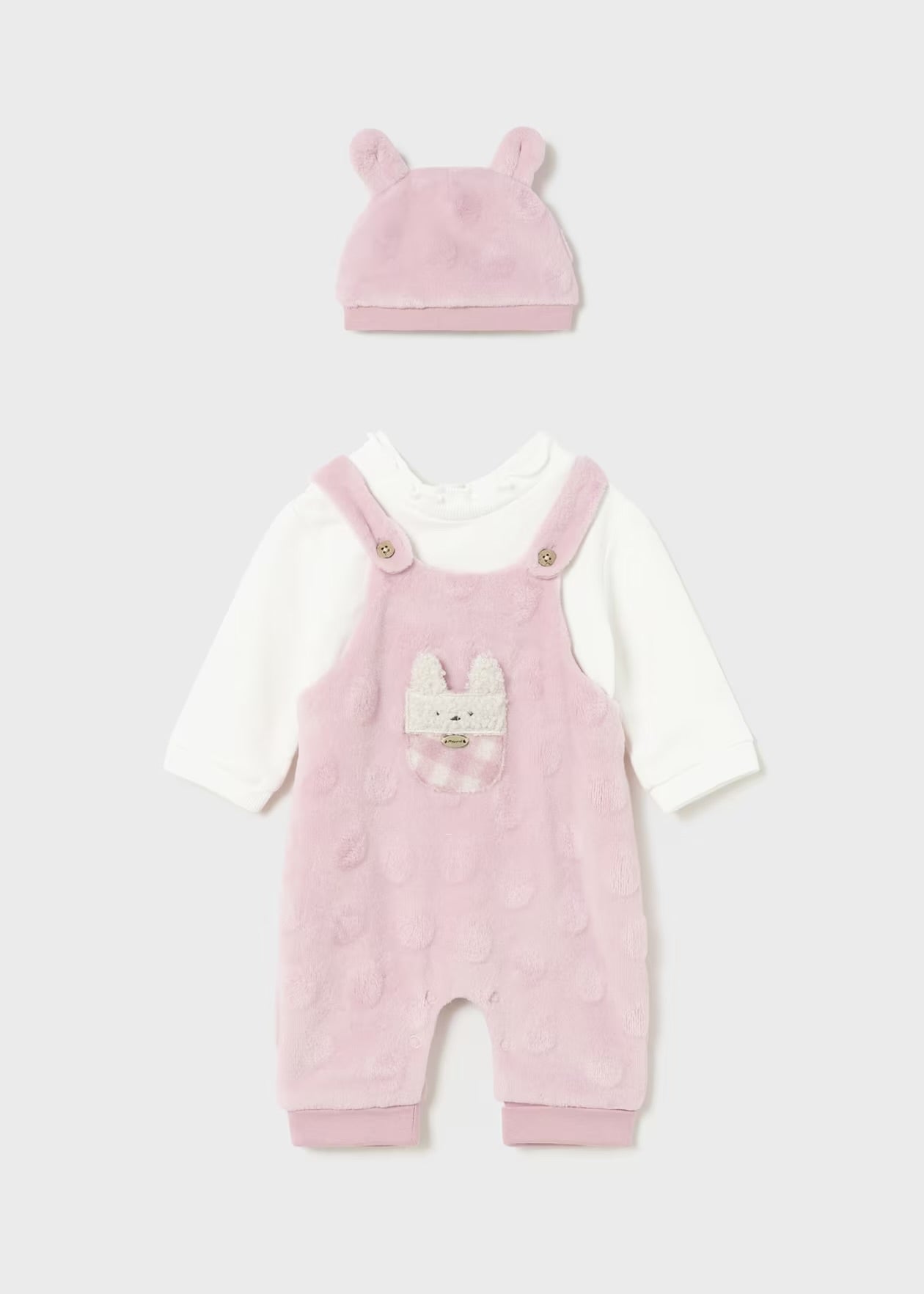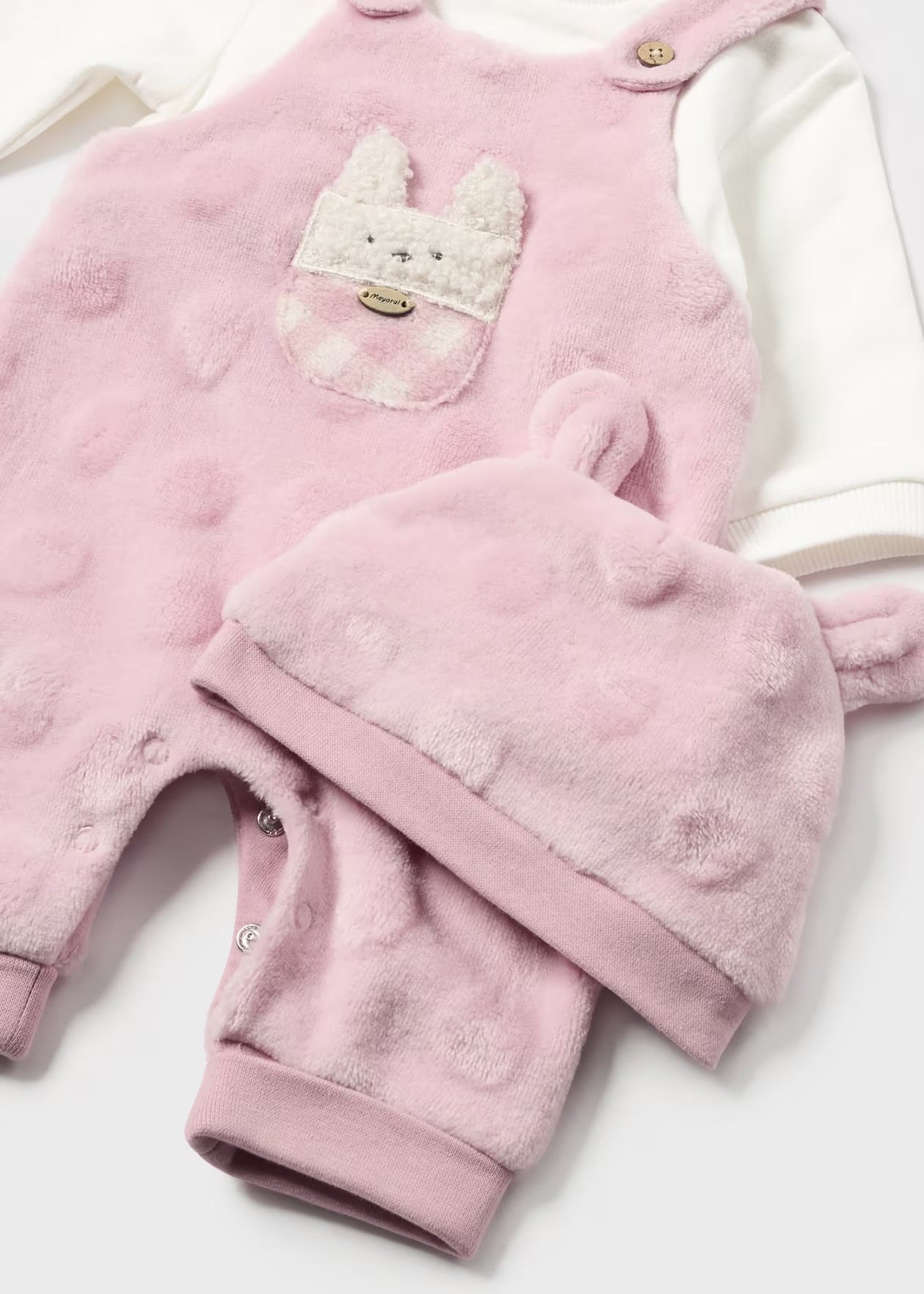 Set trei piese pentru fetite compus din salopeta, vluzita si caciulita. Aplicatii in forma de iepuras. Material pufos, moale si placut la atingere. Cadoul ideal pentru evenimentul bebelusului tau
