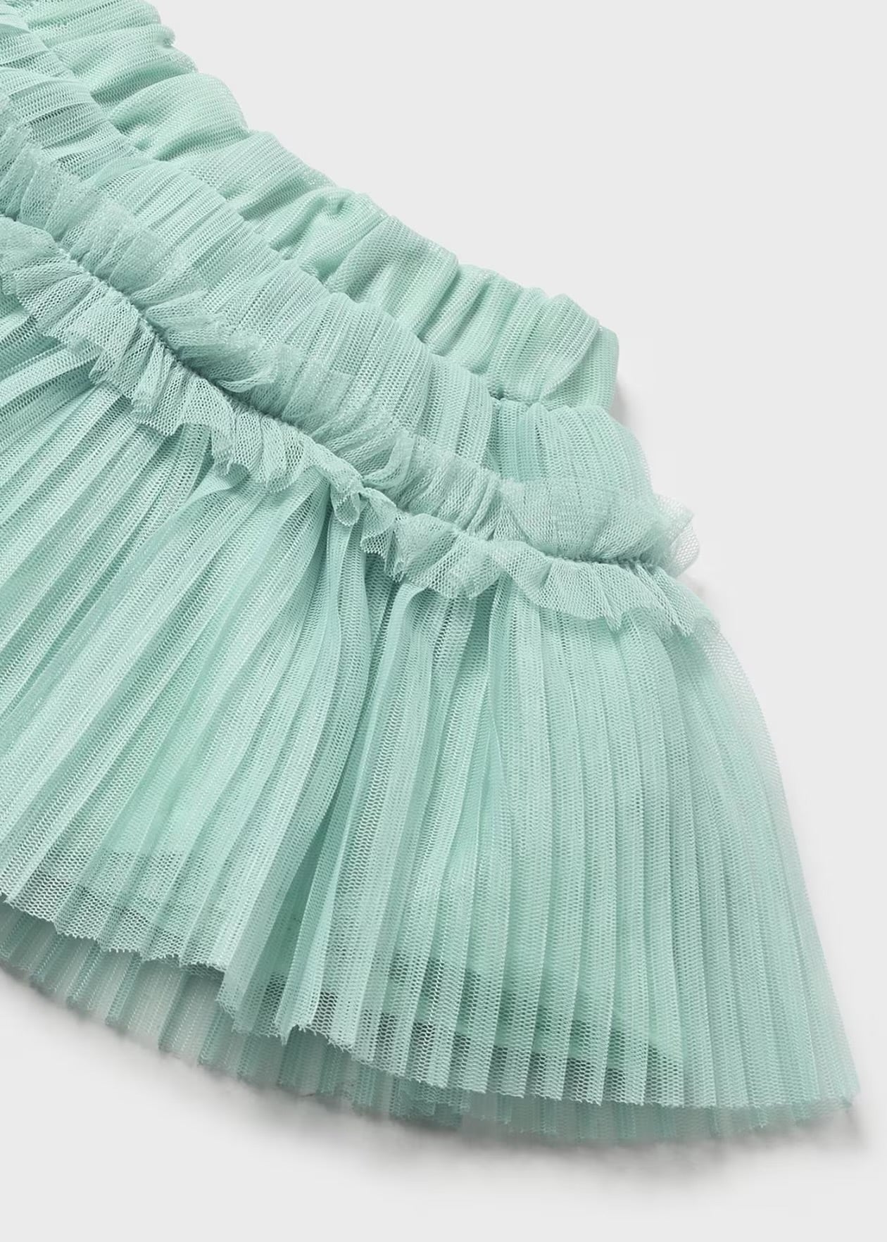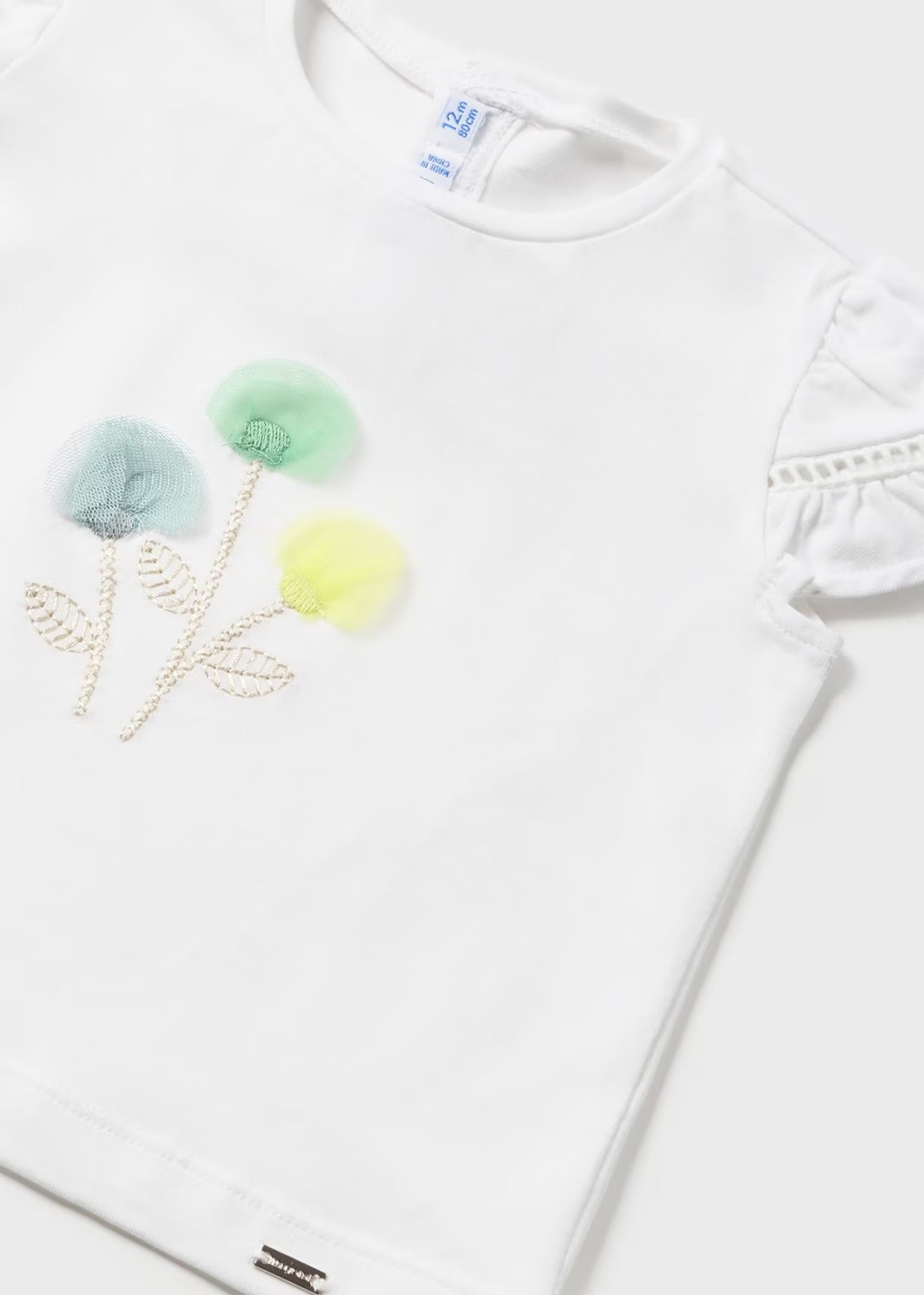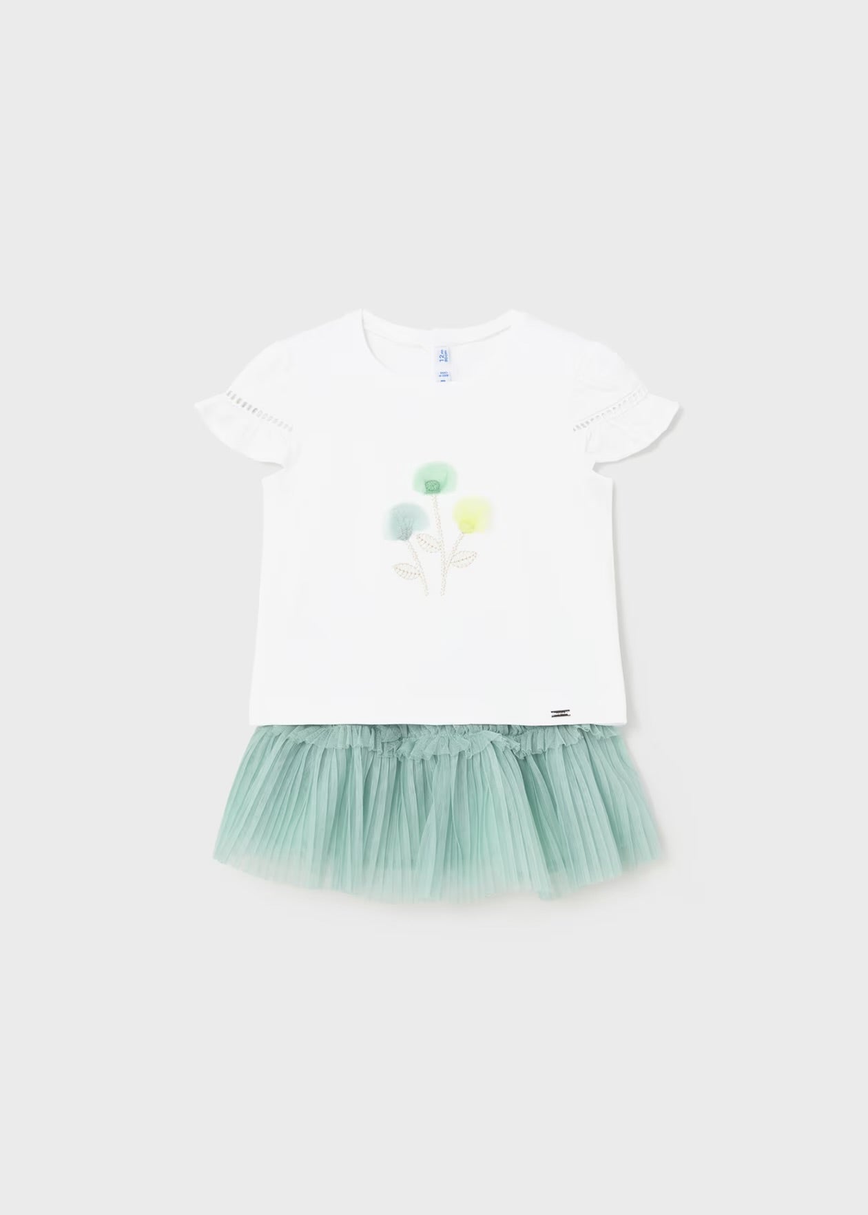 Setul este compus din tricou brodat cu elemente florale din tulle si fusta din tulle cu volane si bata cu elastic
