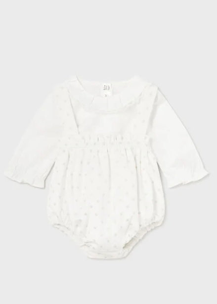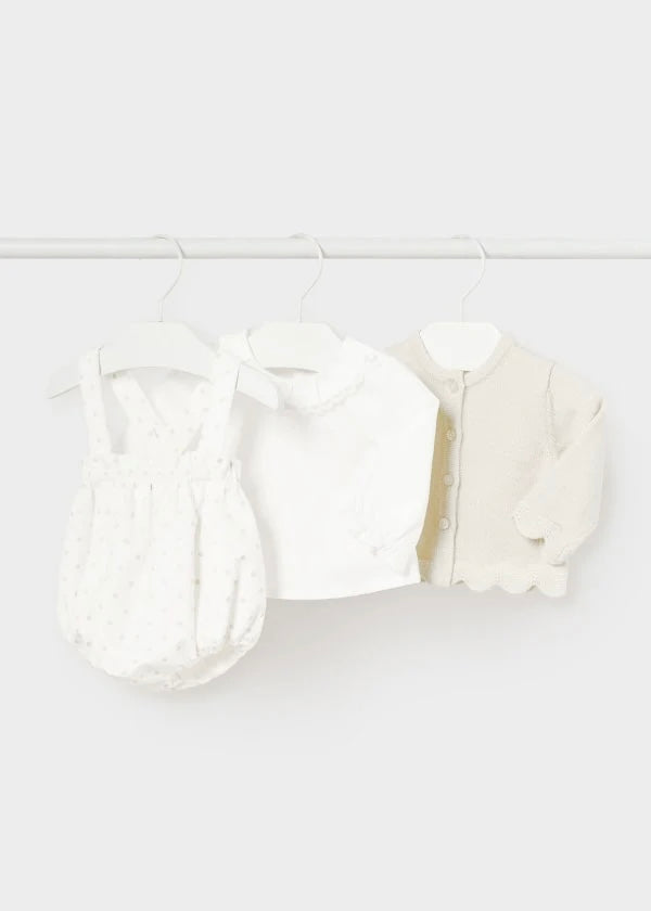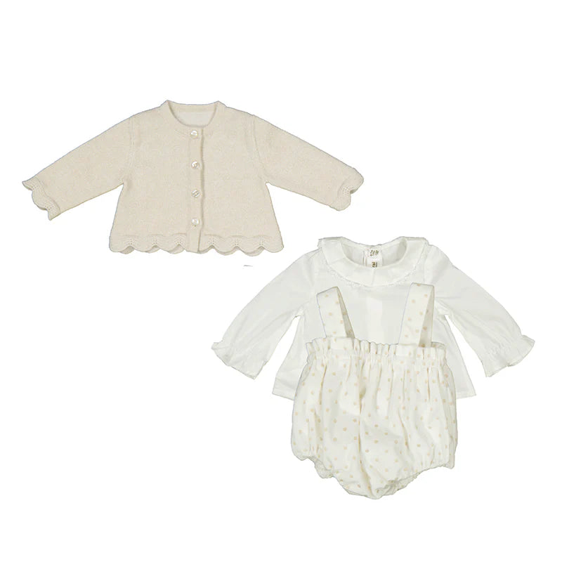 Set trei piese pentru fetite, compus din bolero tricotat, camasuta satinata cu volane si salopeta cu buline. Outfit pentru ceremonii, cadouri sau tinute elegante.