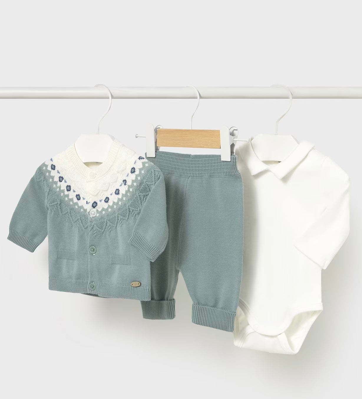 Jacheta tip cardigan cu maneca lunga pentru nou-nascut. Guler rotund. Inchidere cu nasturi pe partea frontala.