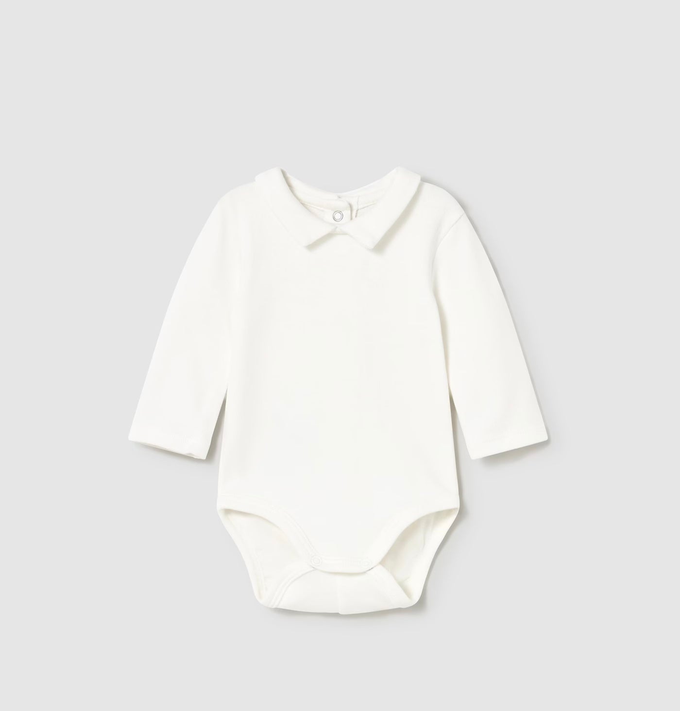 Body cu maneca lunga pentru nou-nascut. Guler camasa. Inchidere prin capse pe partea posterioara. Capse intre picioare pentru a facilita imbracarea articolului.