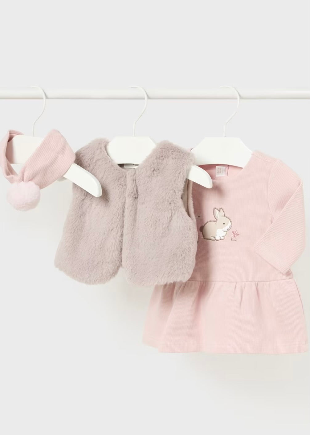 Setul din trei piese pentru fetite este compus din vestuta blanita, rochita si bentita.